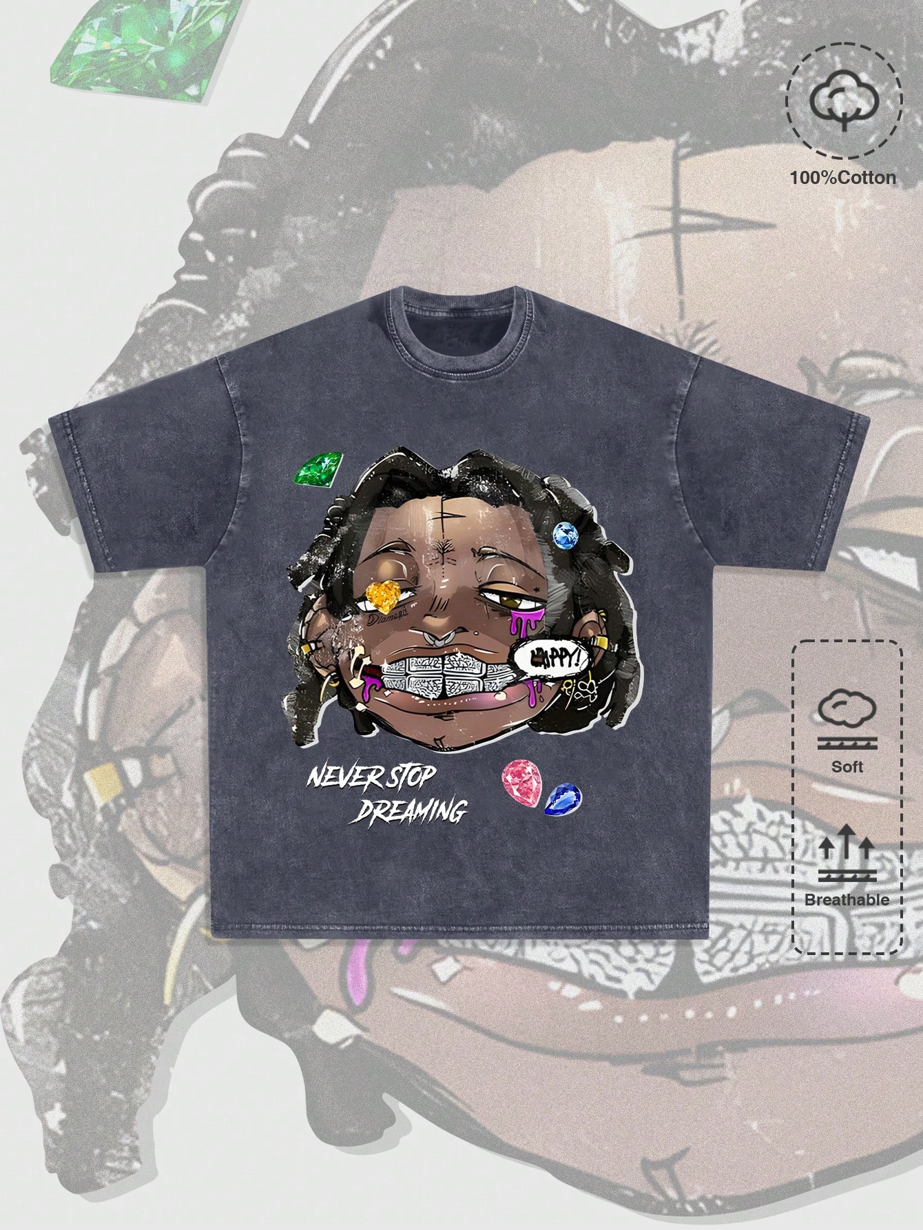 Street Life T-shirt col rond vintage délavé à flocons de neige pour hommes, convient pour le port casual quotidien, printemps/été