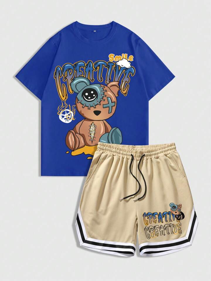 Street Life 2 pièces/Ensemble T-shirt imprimé d'ours en peluche graphique et short de sport assorti pour homme, convient pour le port quotidien, printemps/été