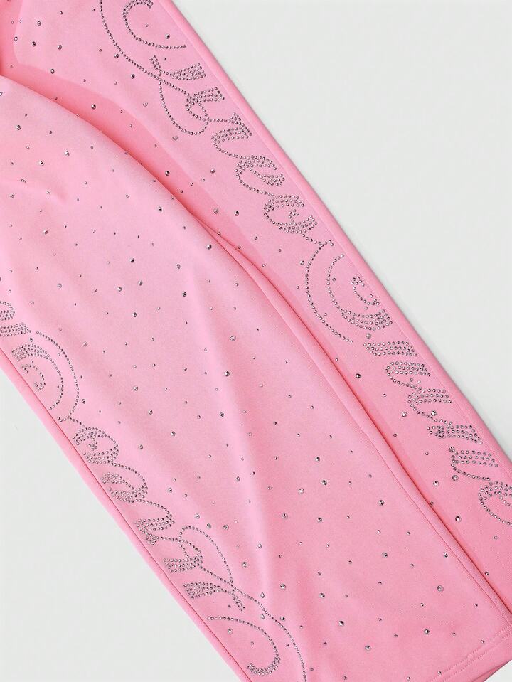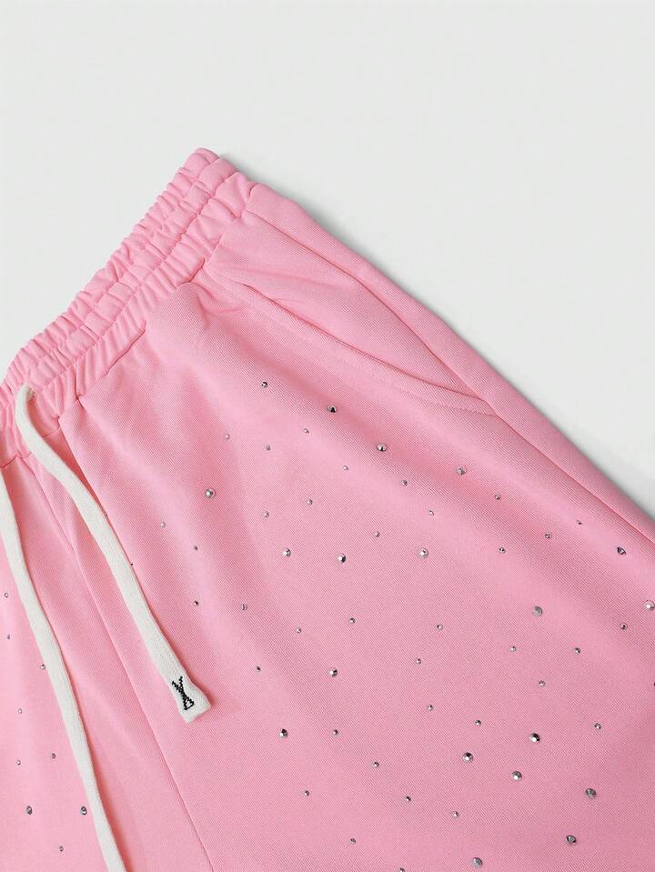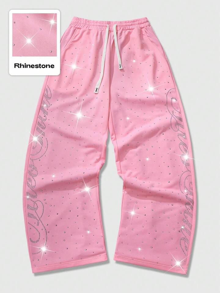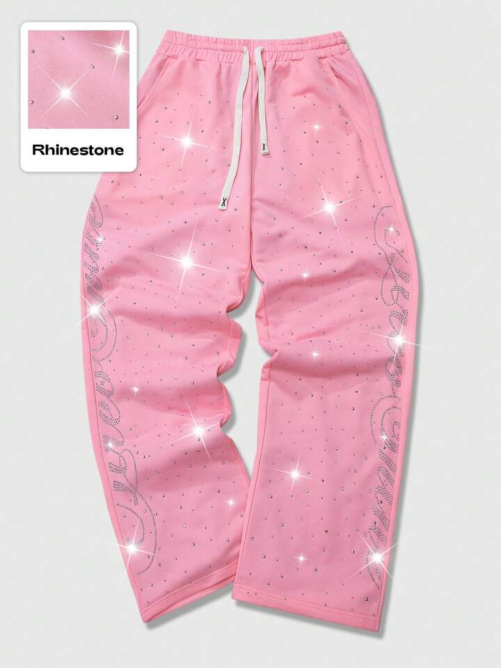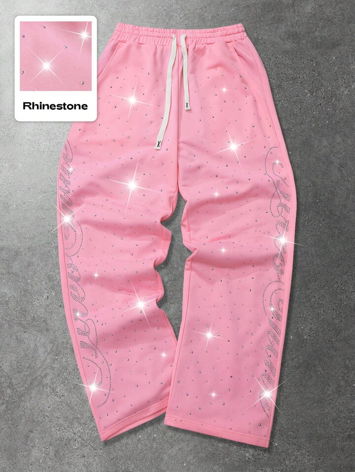 Street Life Pantalon de survêtement unisexe style streetwear avec texte anglais et strass, coupe droite