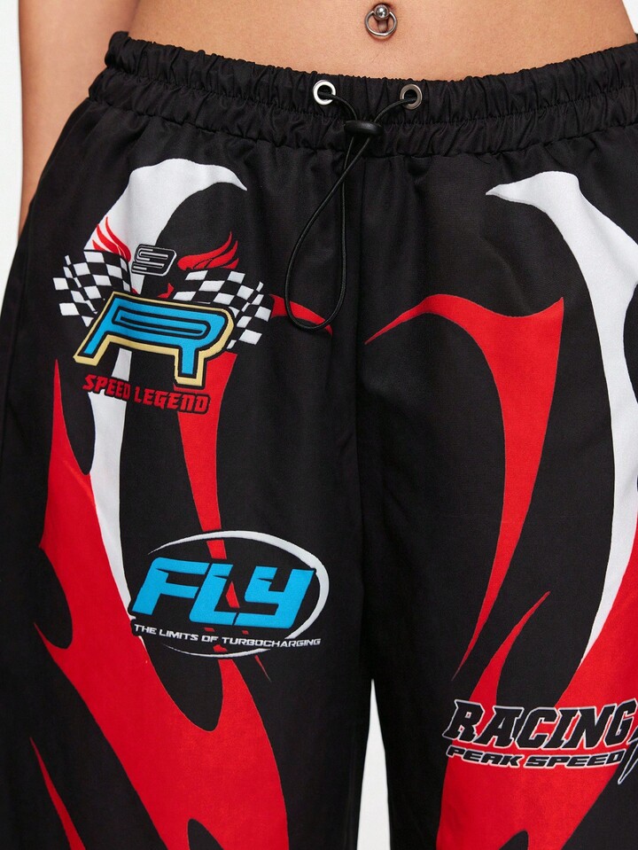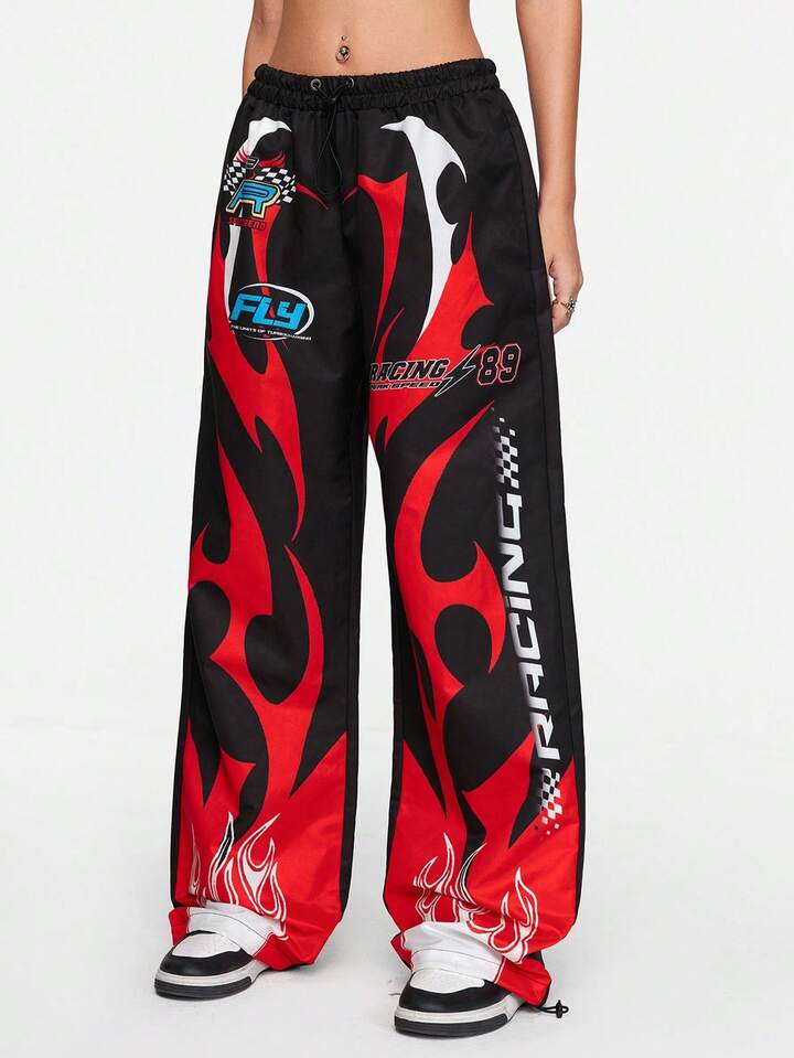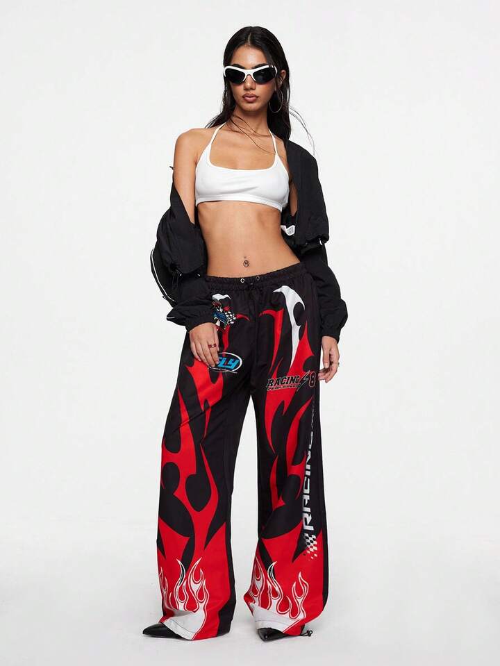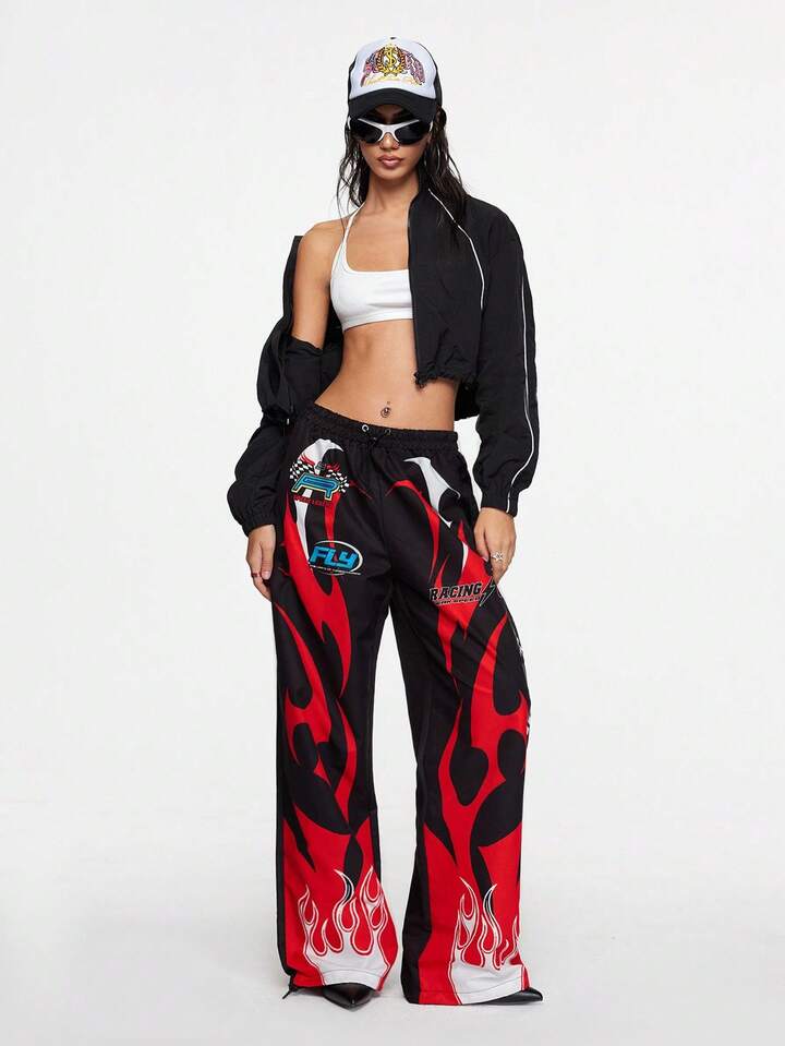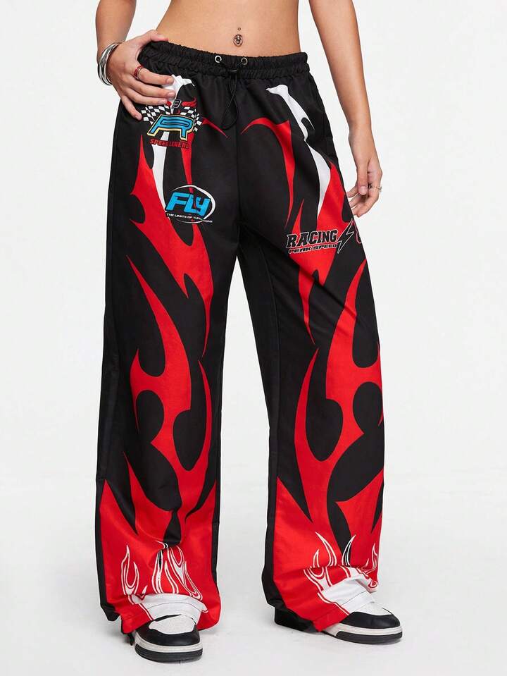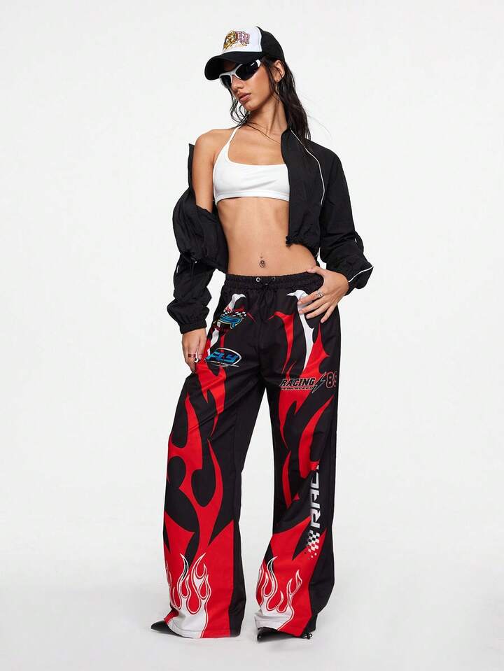 Street Life Pantalon parachute style de rue des femmes, style cyberpunk avec flammes et badges épineux