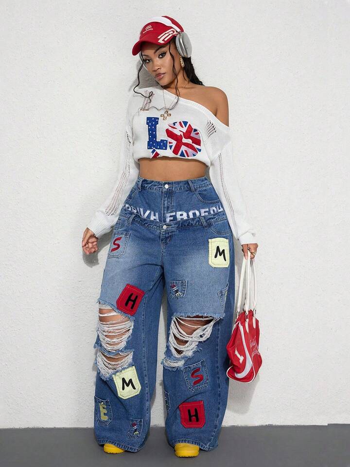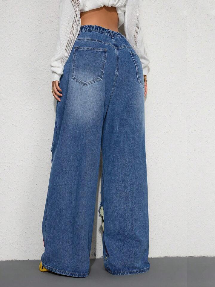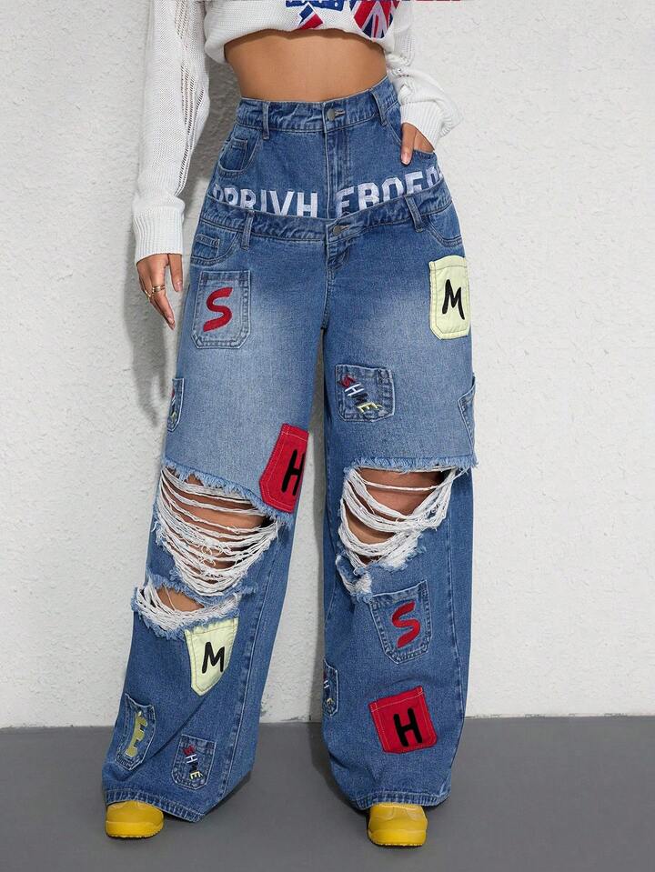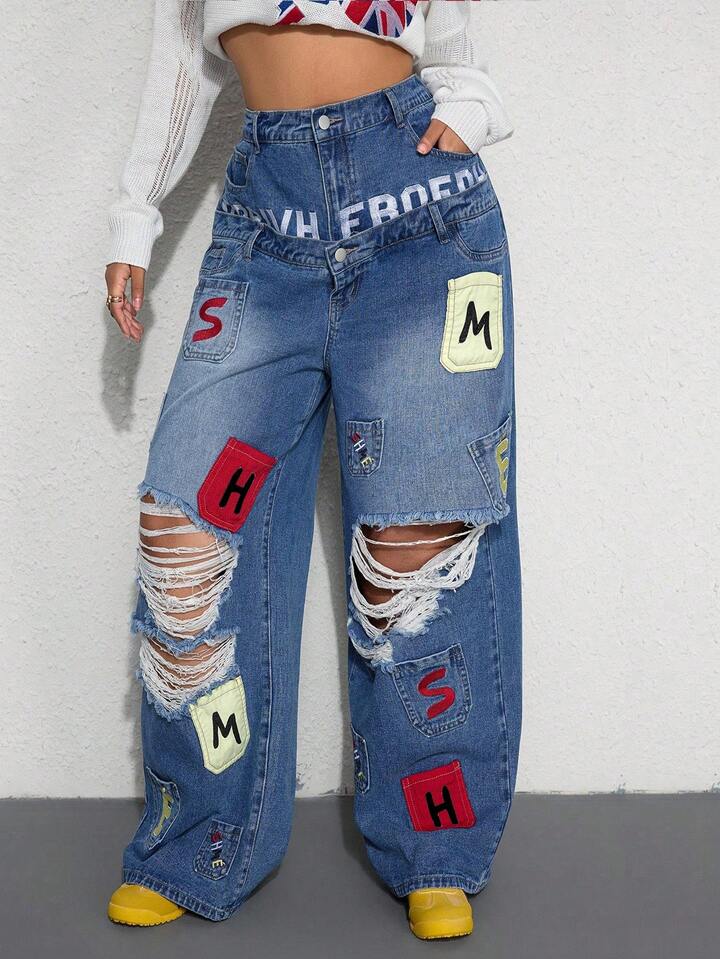 Street Life Jeans amples style de rue décontracté Y2K avec poche et design de broderie, double ceinture taille