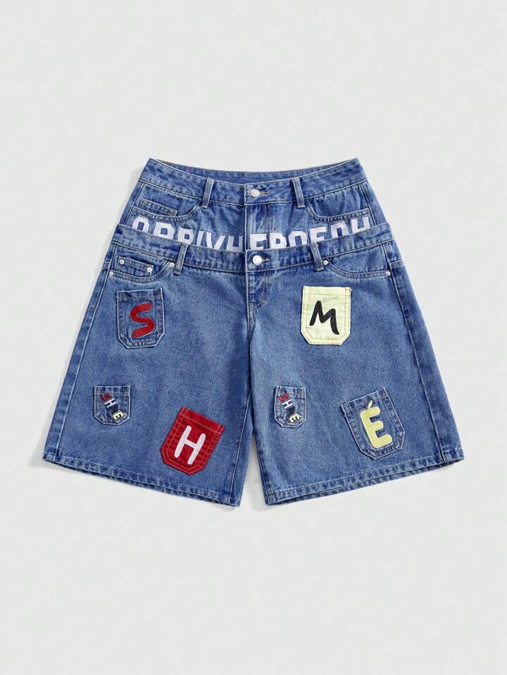 Street Life Short en jean ample, taille basse, avec design à double taille et broderie, style streetwear Y2K