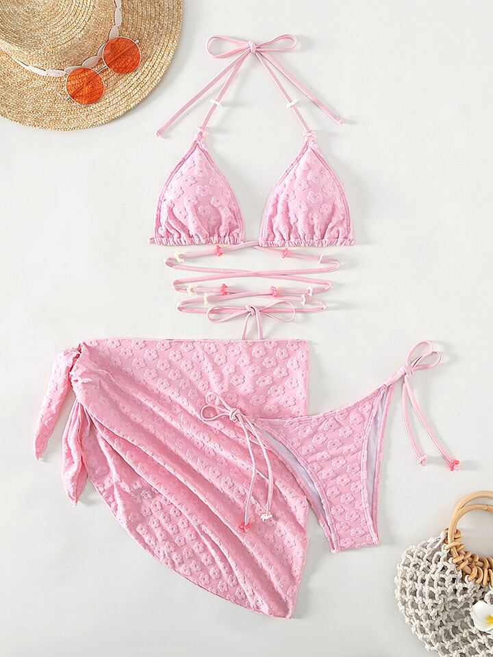 Bikini perlé fleuri floqué ras-du-cou triangulaire soutien-gorge & Bas à nœud & jupe de plage 3 pièces Maillot de bain
