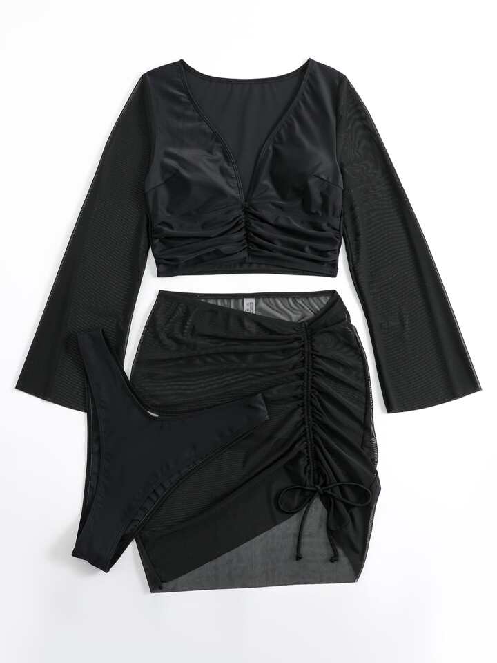 Ensemble tankini transparent avec top à manches trois-quarts et bas de tankini et jupe de cache-maillot - ensemble de trois pièces pour maillot de bain