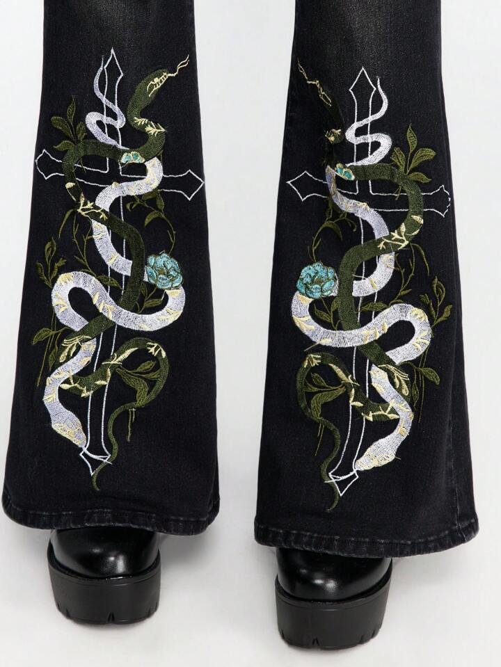 Jeans évasés pour femme avec broderie en serpent sombre et croix gothique pour l'été