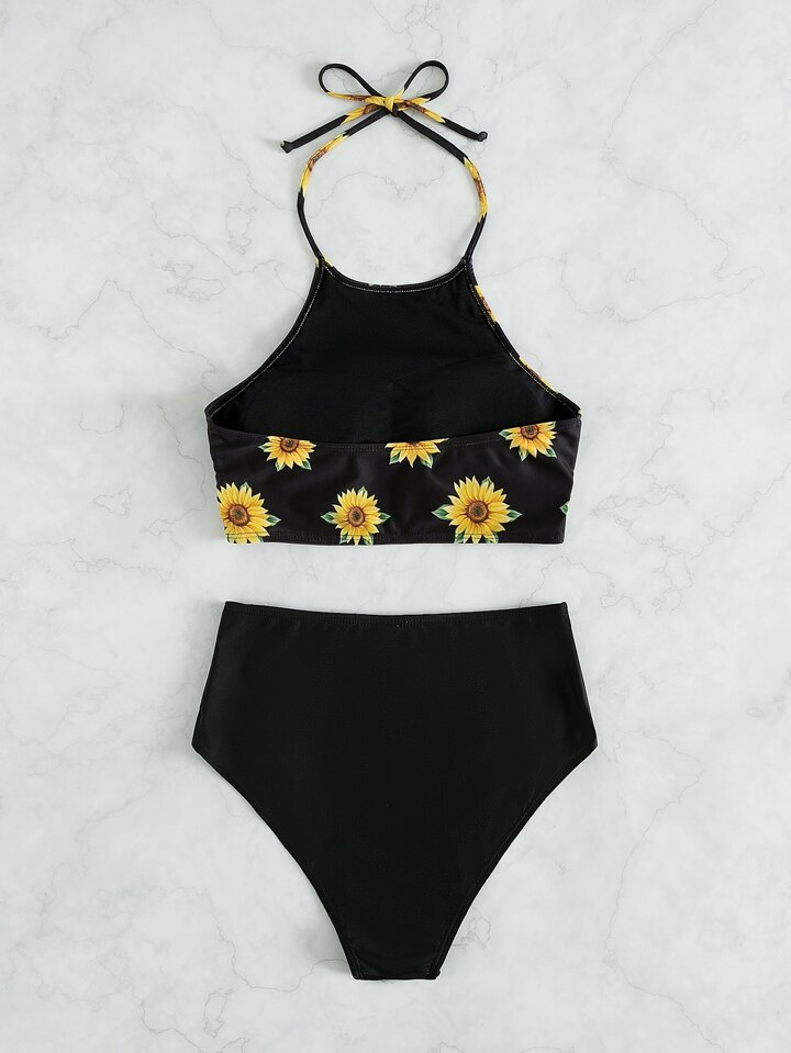 Ensemble tankini imprimé tournesol avec Top à col montant et tankini taille haute 2 pièces, pour les vacances à la plage en été