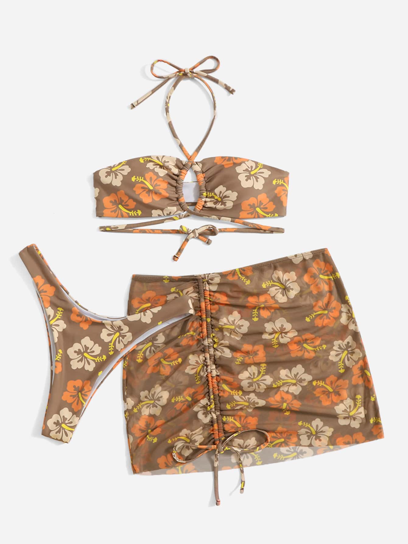 Sweetness Ensemble bikini d'été à imprimé floral à lacets, taille haute et col ras-du-cou avec jupe de plage - 3 packs