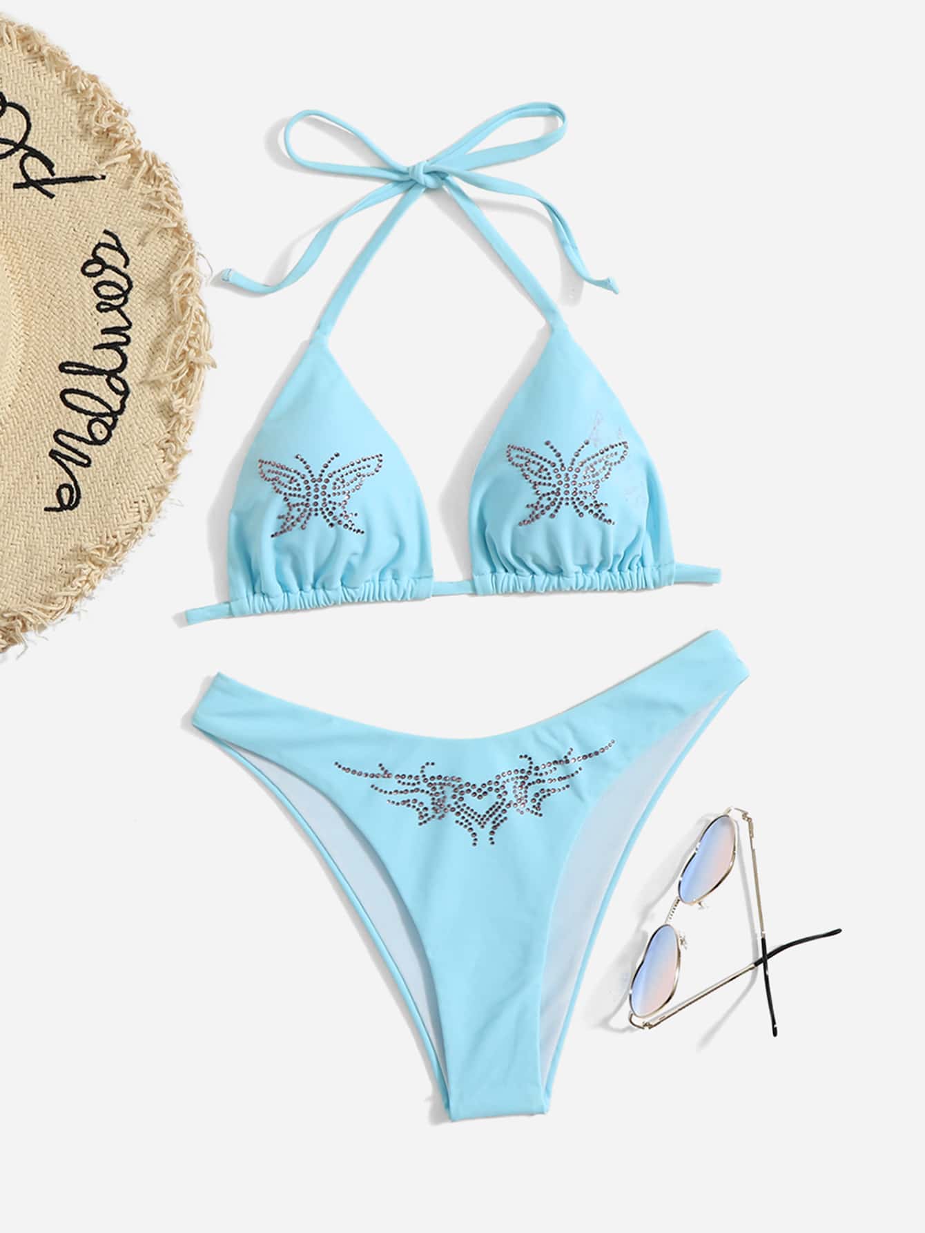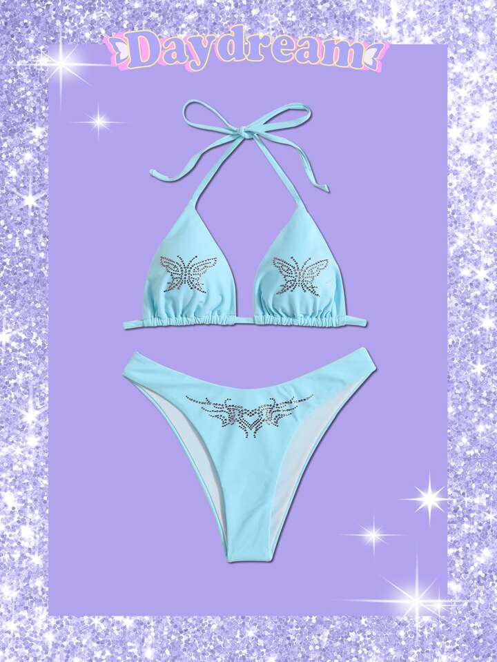 Sweetness Ensemble bikini d'été à bretelles avec strass, graphique de papillon et de cœur