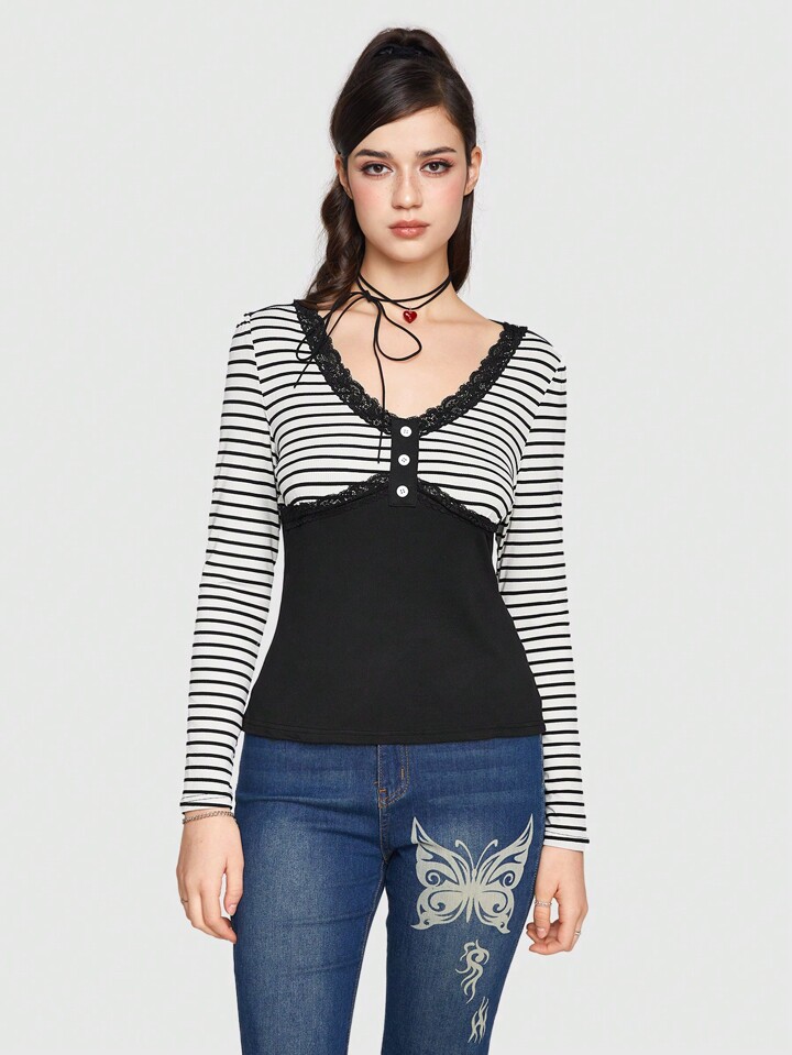 Sweetness T-shirt À Manches Longues En Dentelle À Patchwork Rayé Vintage Pour Femmes