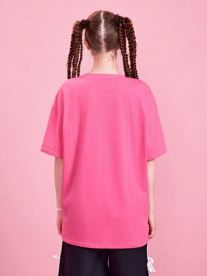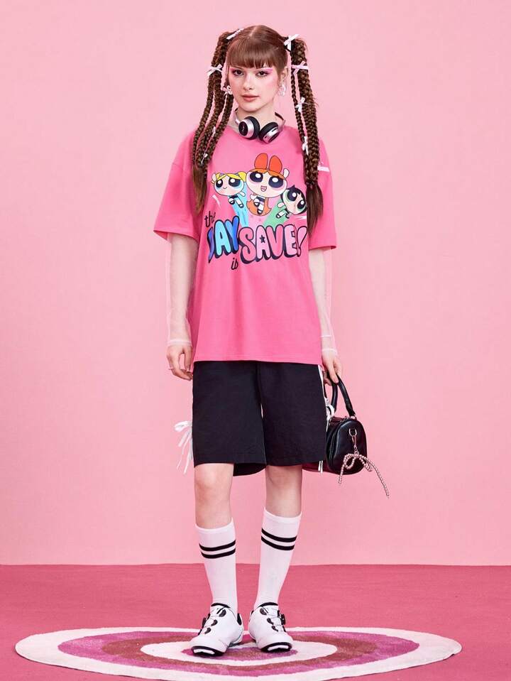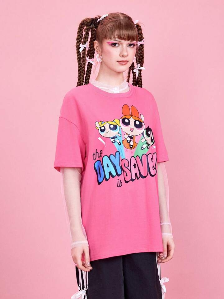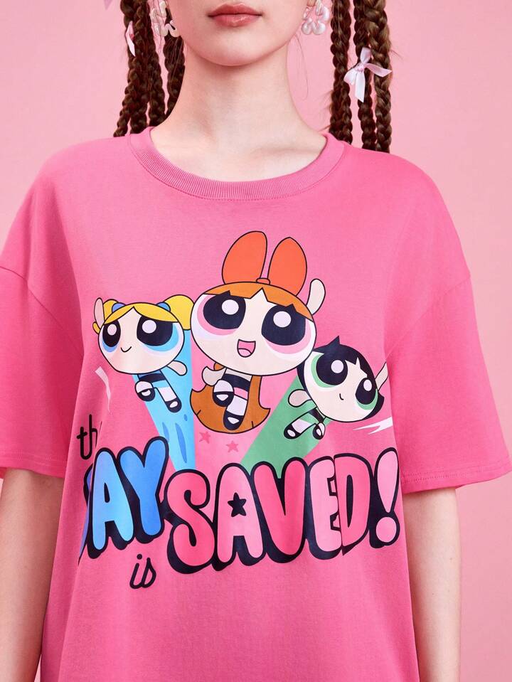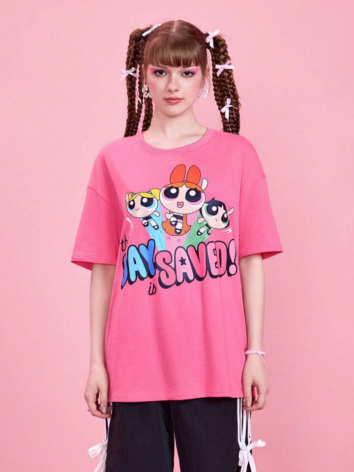 The Powerpuff Girls | ROMWE T-shirt à manches courtes avec épaules tombantes à motif de figure de dessin animé mignon pour femmes, été, école