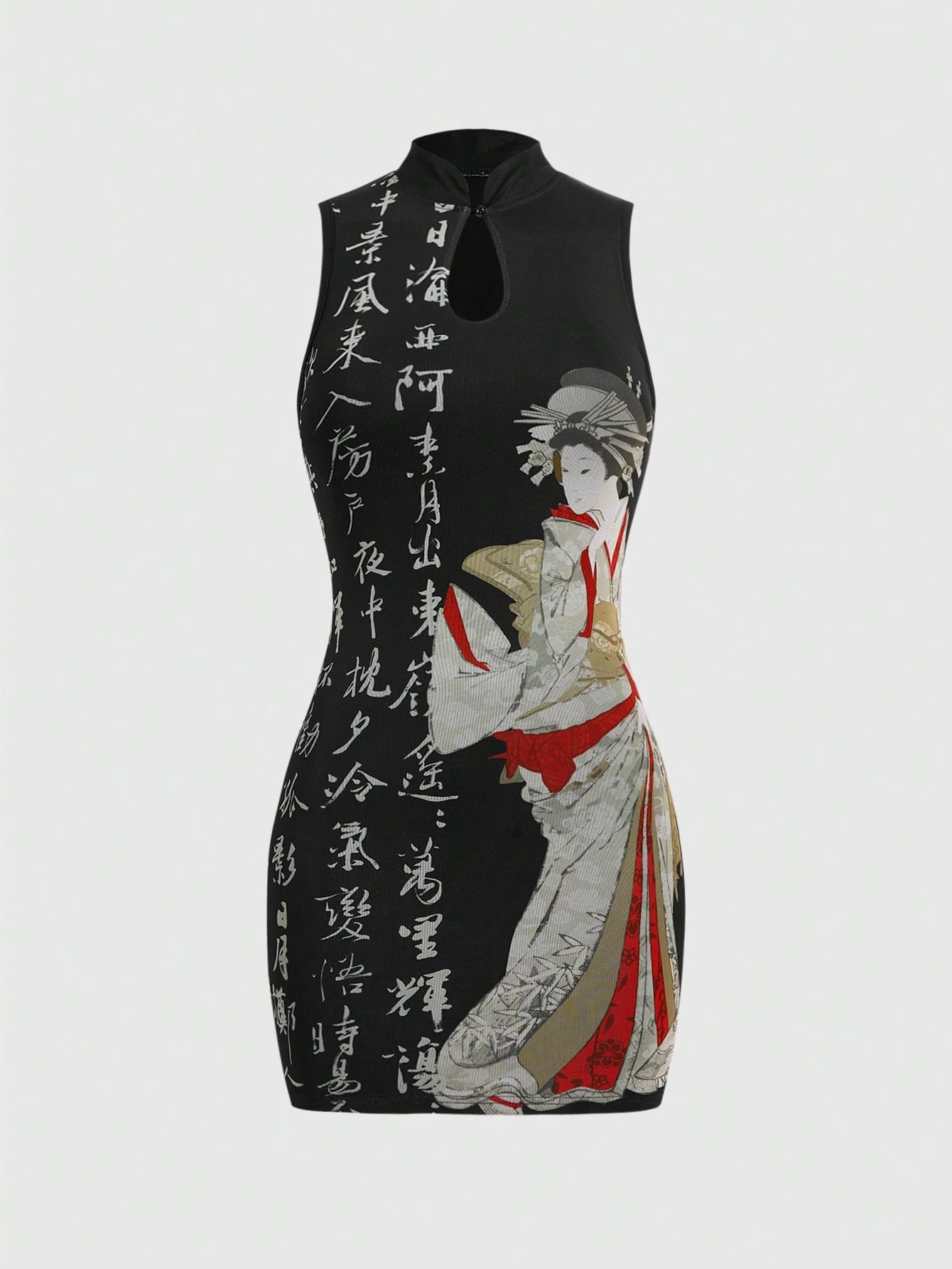 ROMWE Avant Robe moulante mini à col mao et fermeture à boutons de style chinois vintage, avec imprimé calligraphie chinoise et géisha pour femmes