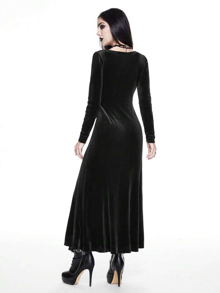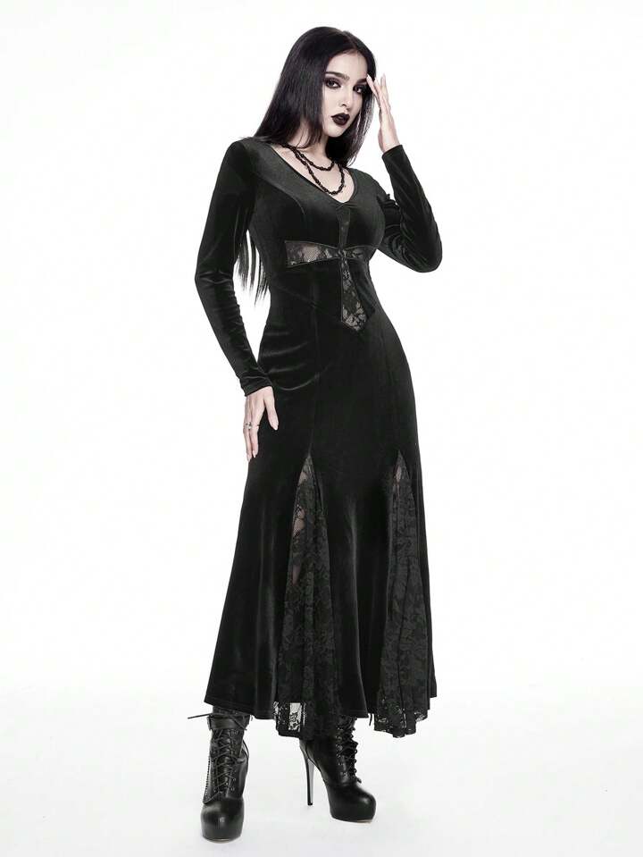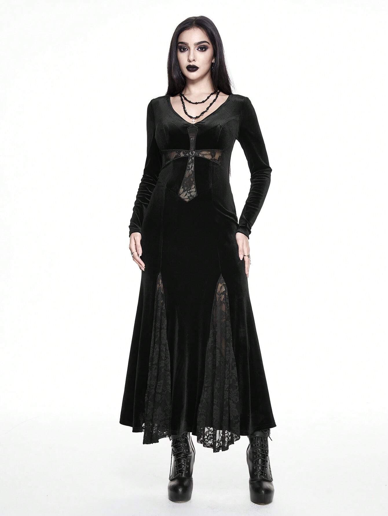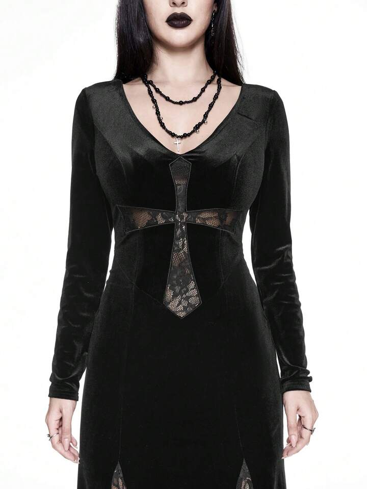 Robe moulante vintage gothique sombre avec motif croix ajouré en dentelle pour femmes