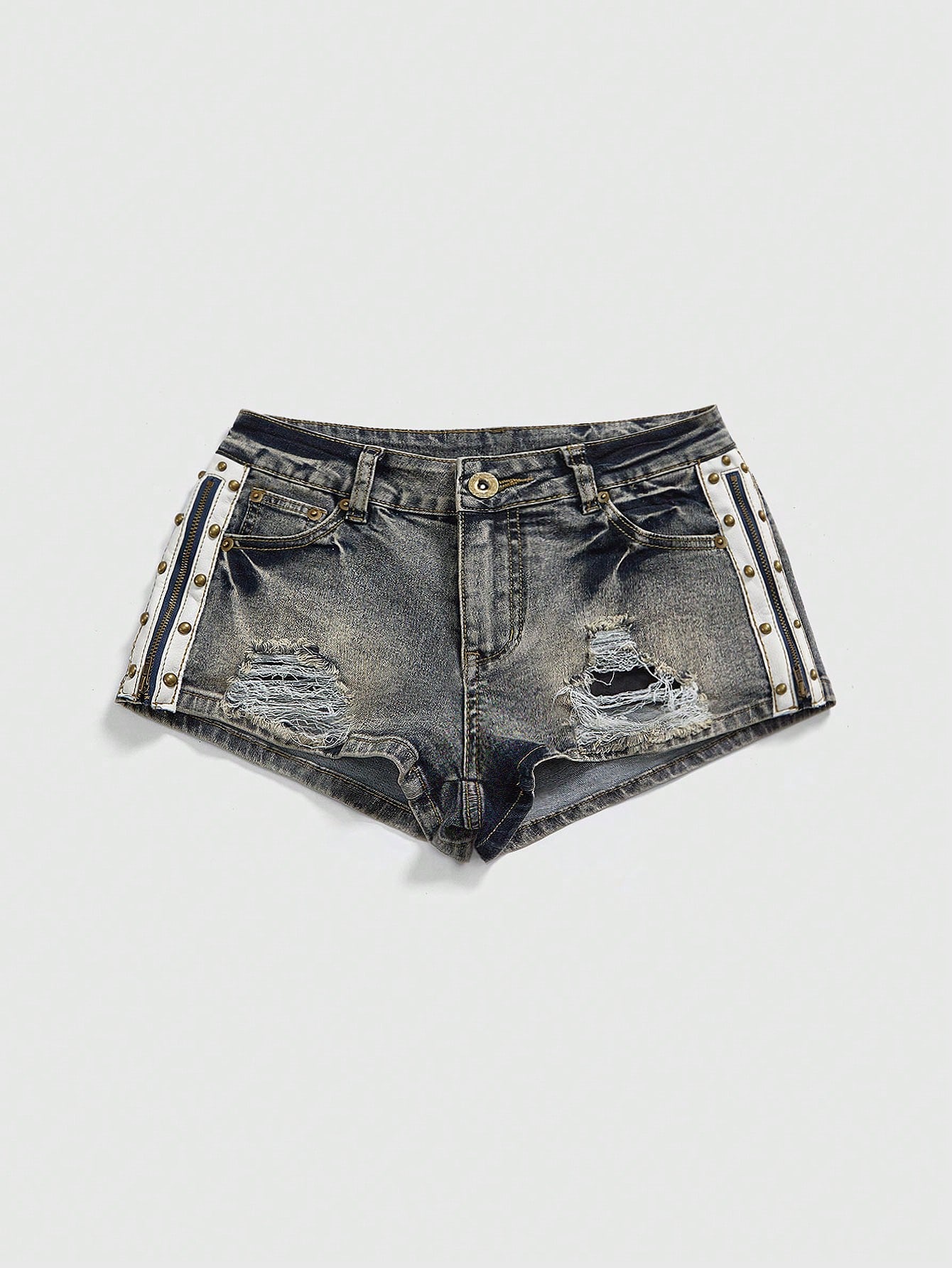 Grunge Punk Mini-shorts en jean à taille basse pour femmes, style rétro délavé Y2K avec rivets décoratifs. Polyvalents pour diverses occasions, idéaux pour l'été.