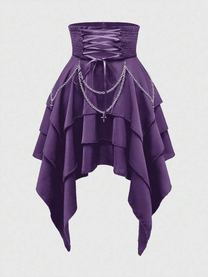 Jupe vintage gothique à taille haute avec chaîne métallique amovible, taille super haute avec laçage, taille cintrée, ourlet asymétrique multicouche pour femmes