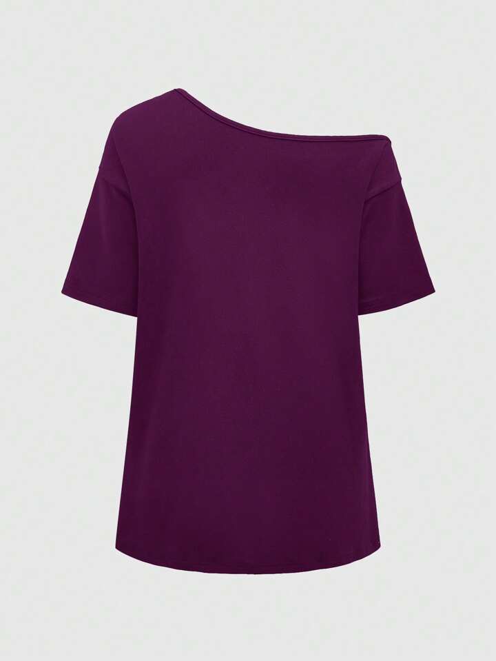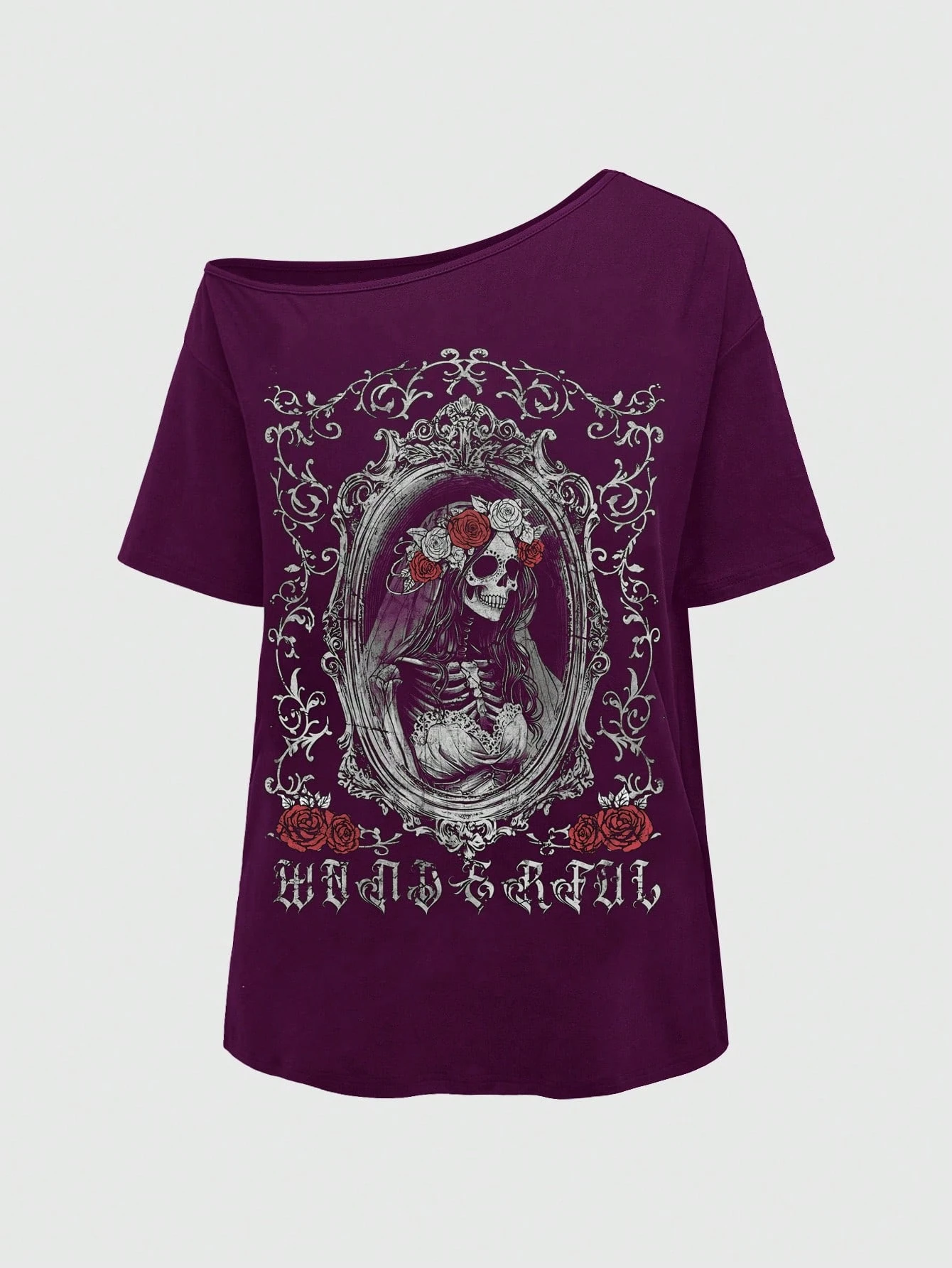 T-shirt ample asymétrique à l'épaule tombante avec imprimé graphique vintage crâne rose gothique délavé, grandes tailles