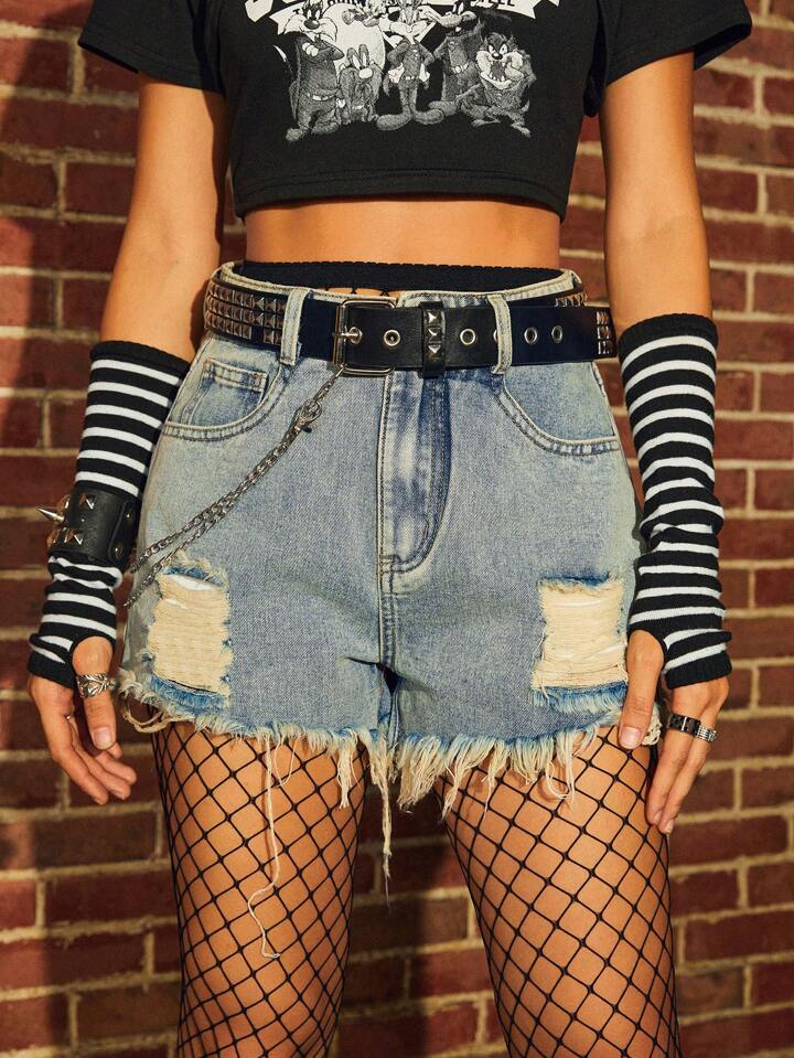 WB 100th | ROMWE Short En Jean Dessin Animé Et Lettre À Ourlet Effiloché Déchiré