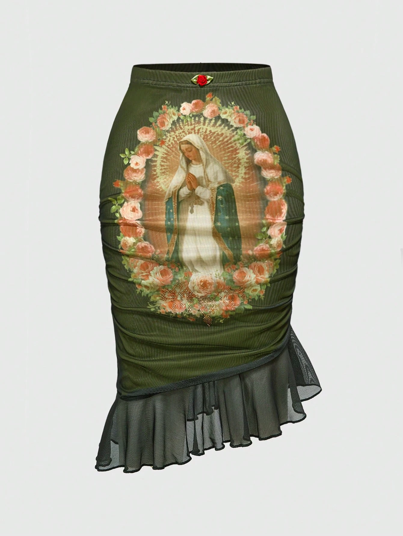 Fairycore Jupe verte en maille style rétro palais avec graphique de la Vierge Marie pour femmes
