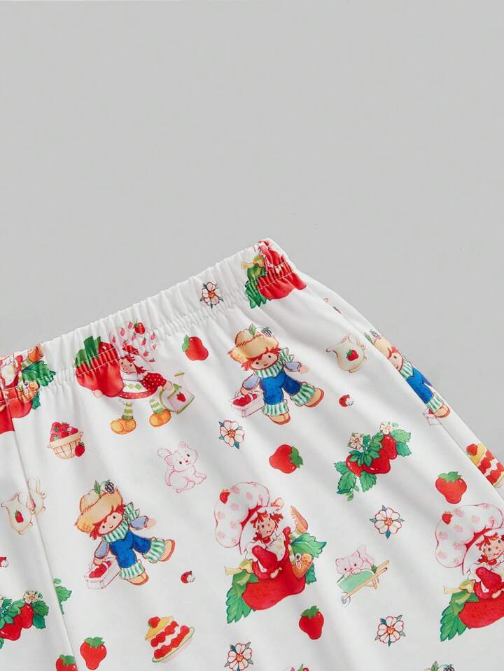 Ensemble pyjama femme constitué d'un debardeur ringer à volant avec imprimé figure de dessin animé et fraise, et d'un short, dans un style décontracté et mignon