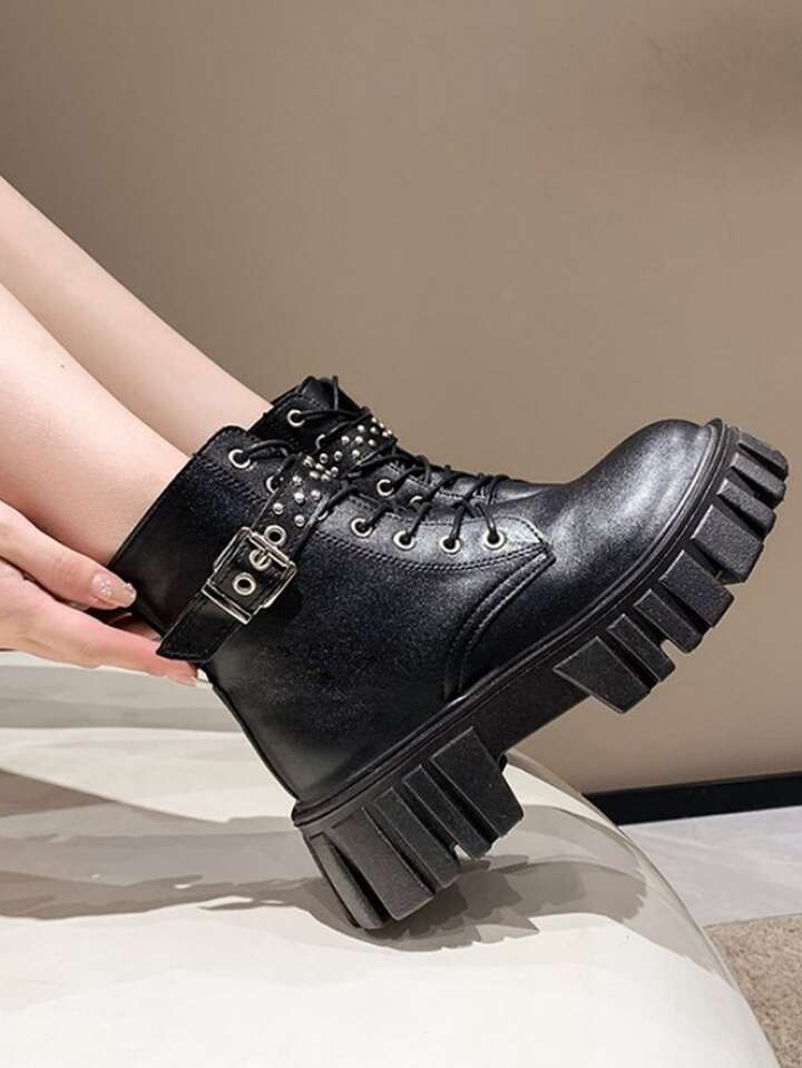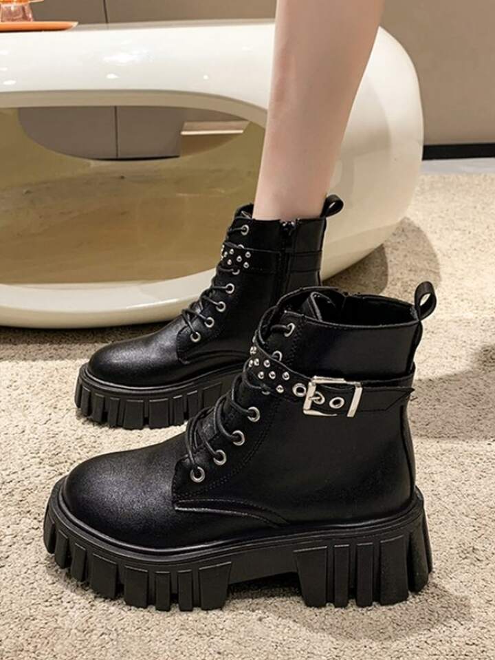 Femme À Lacets Clouté Zippé Bottes De Combat punk Extérieur Bottes