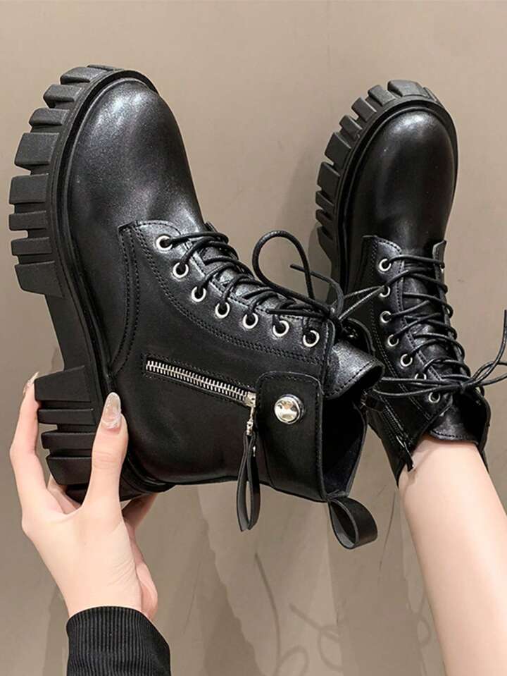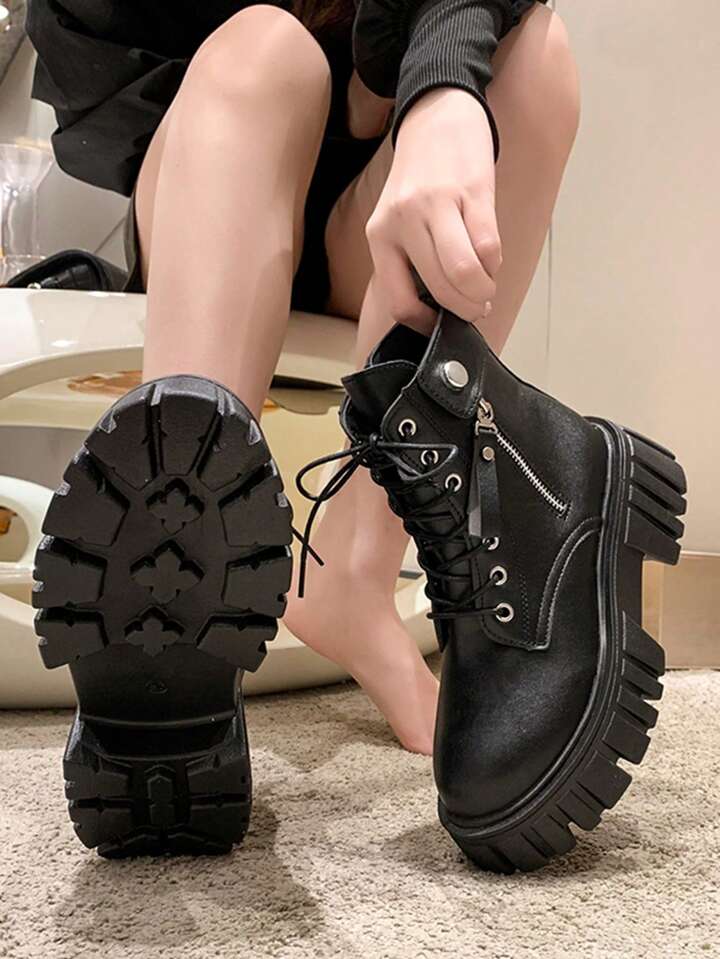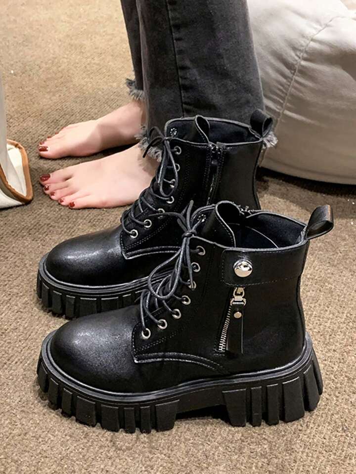 Femme Zippé À Lacets À Bout Rond Bottes De Combat , Cool Extérieur Bottes De Mode