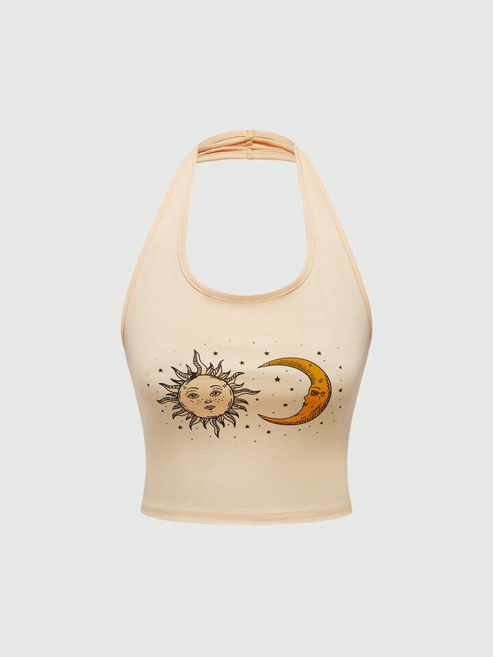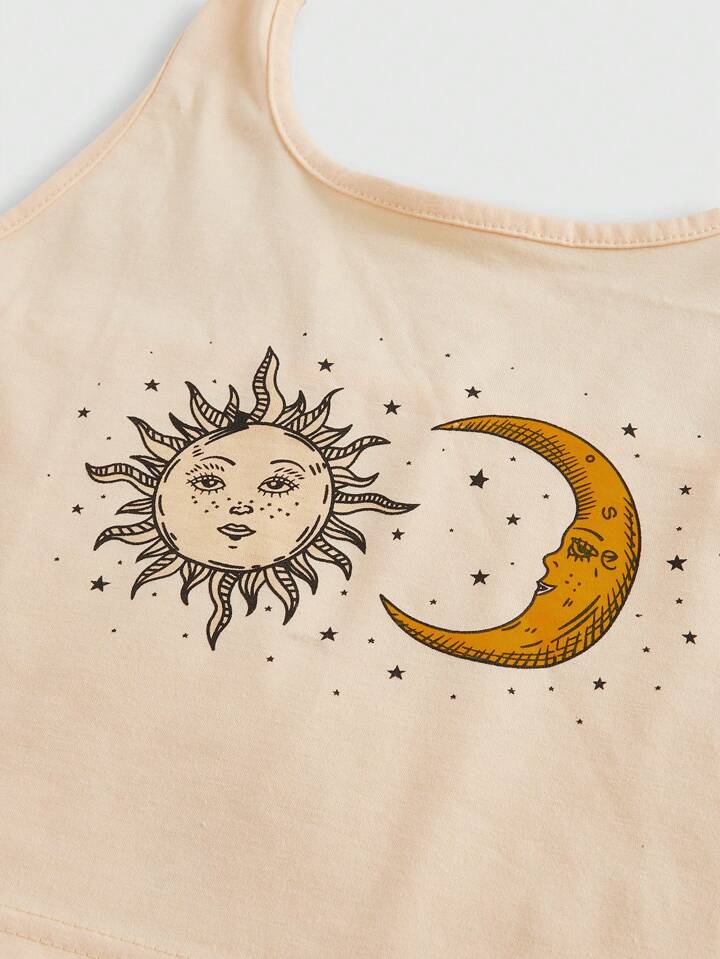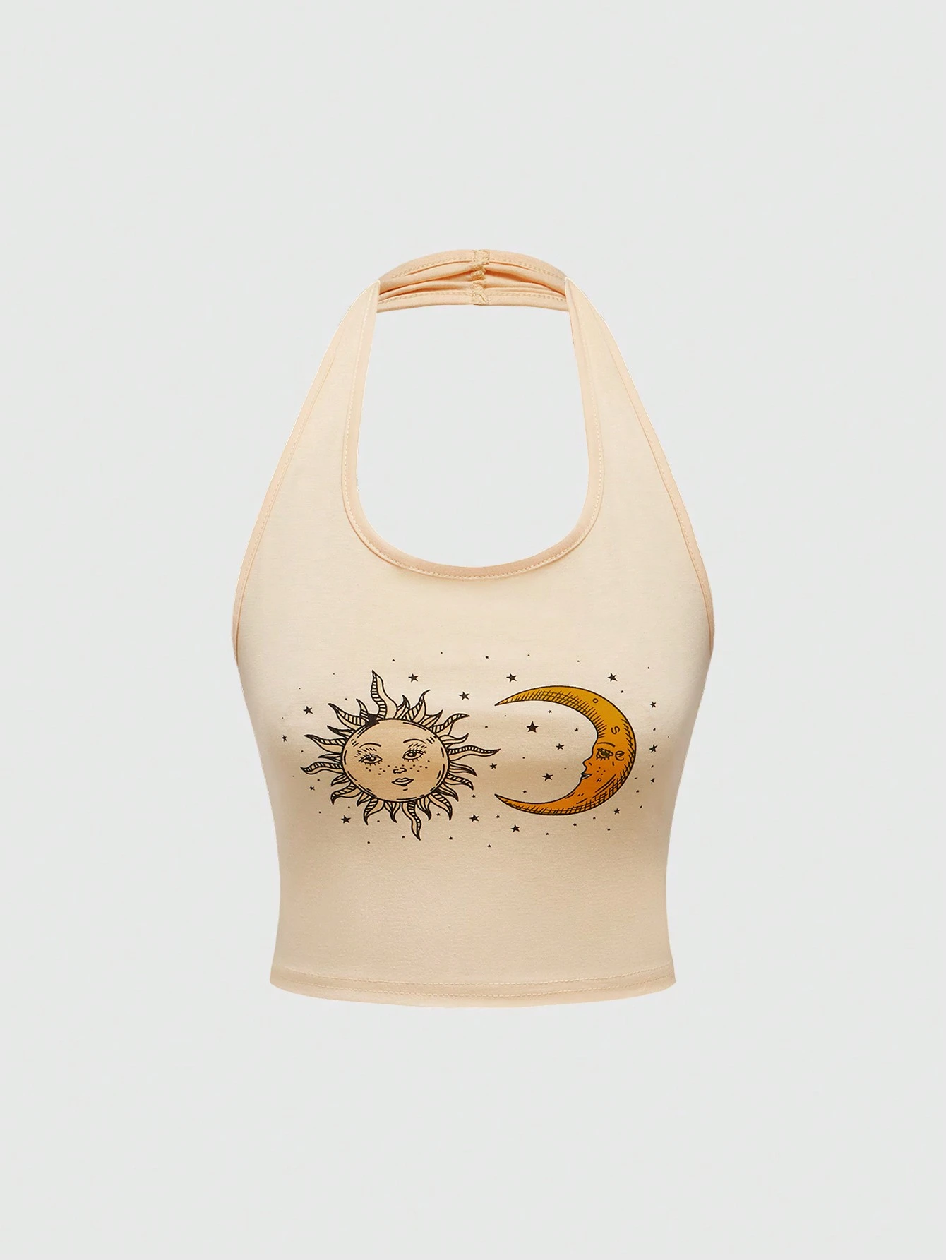 Débardeur femme mode décontractée avec imprimé lune soleil étoile, col montant
