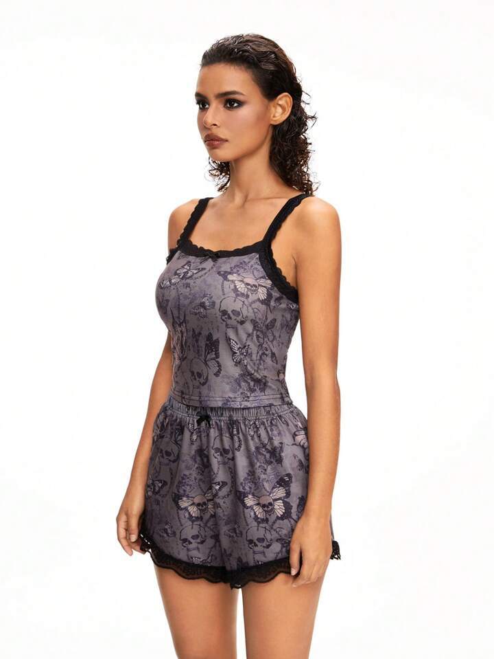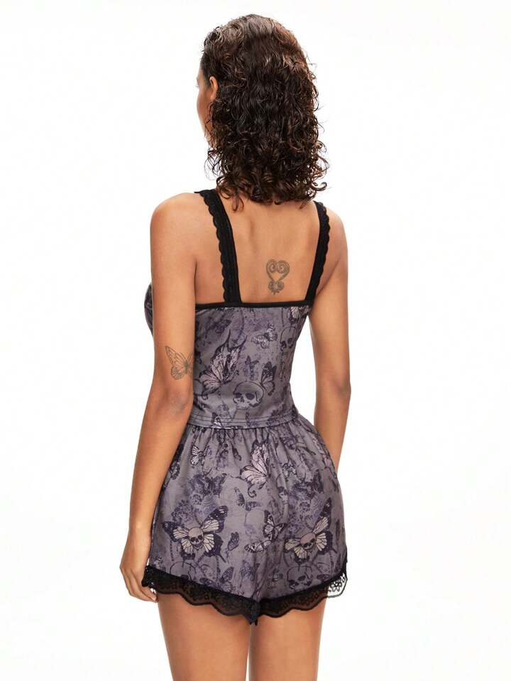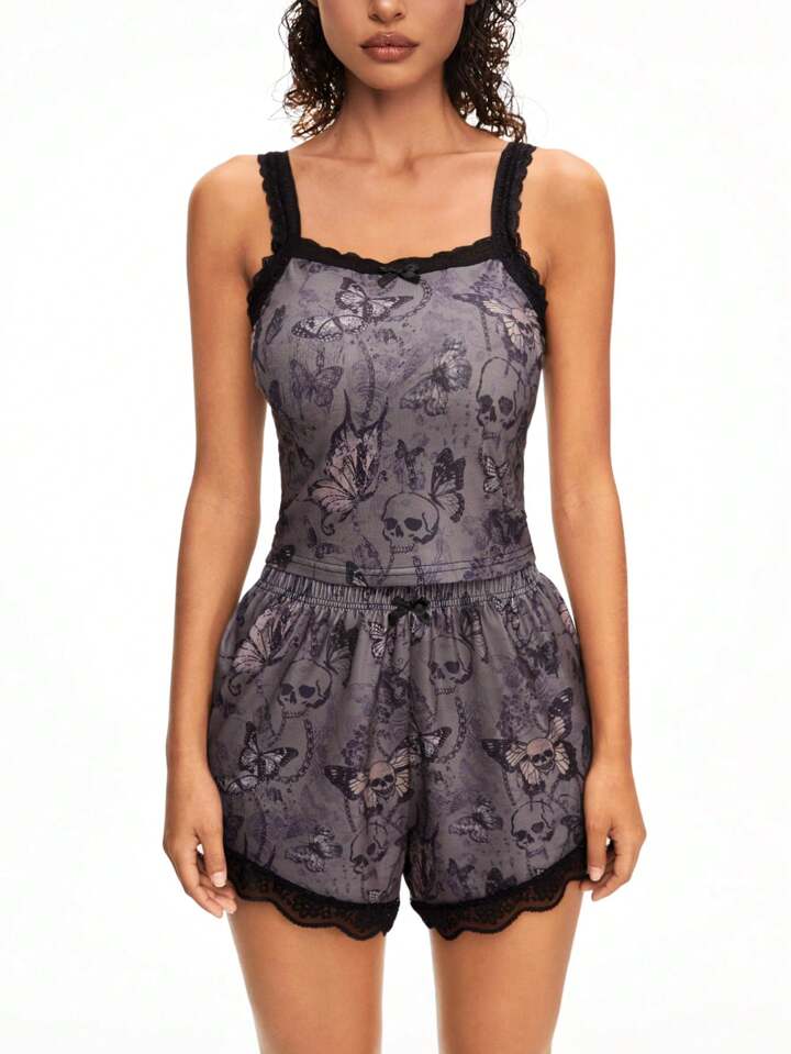 Ensemble pyjama short caraco gothique papillon pour femmes avec motif de crâne sombre, dentelle tricotée ajourée et nœud papillon, noir