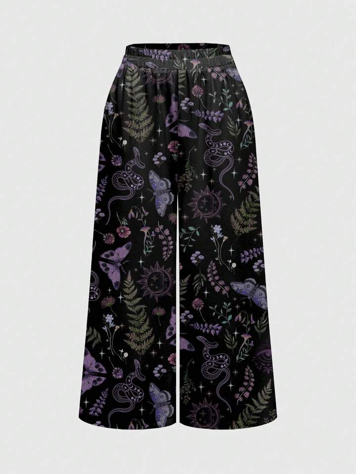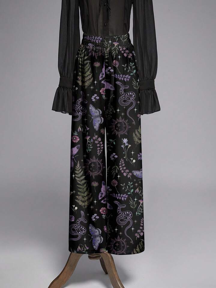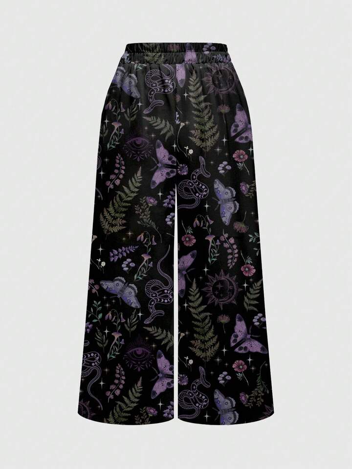 Pantalon ample à jambes larges avec imprimé tout-sur-tout de femmes gothiques, mystérieuses, sorcières, papillons, plantes, serpents, soleil, lune et étoiles