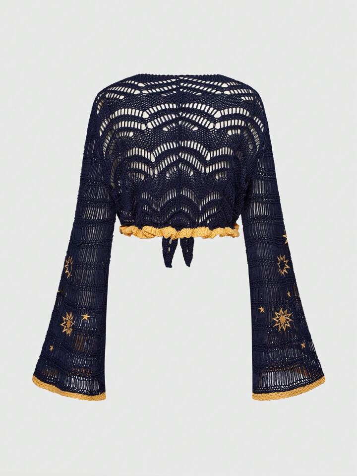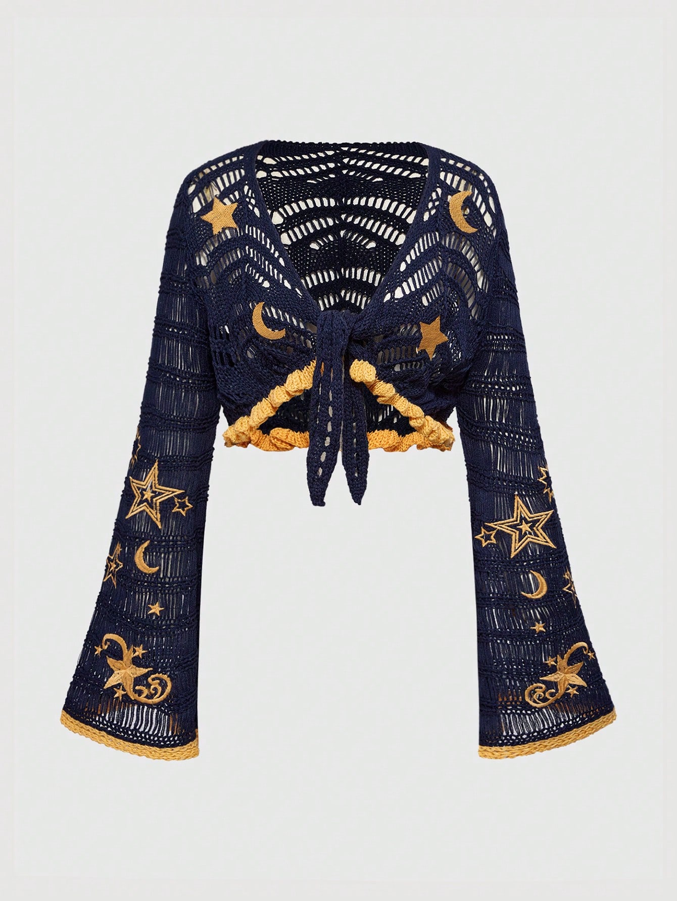 Cardigan évasé à manches évasées avec broderie lune et étoile de style hippie bohème pour femme
