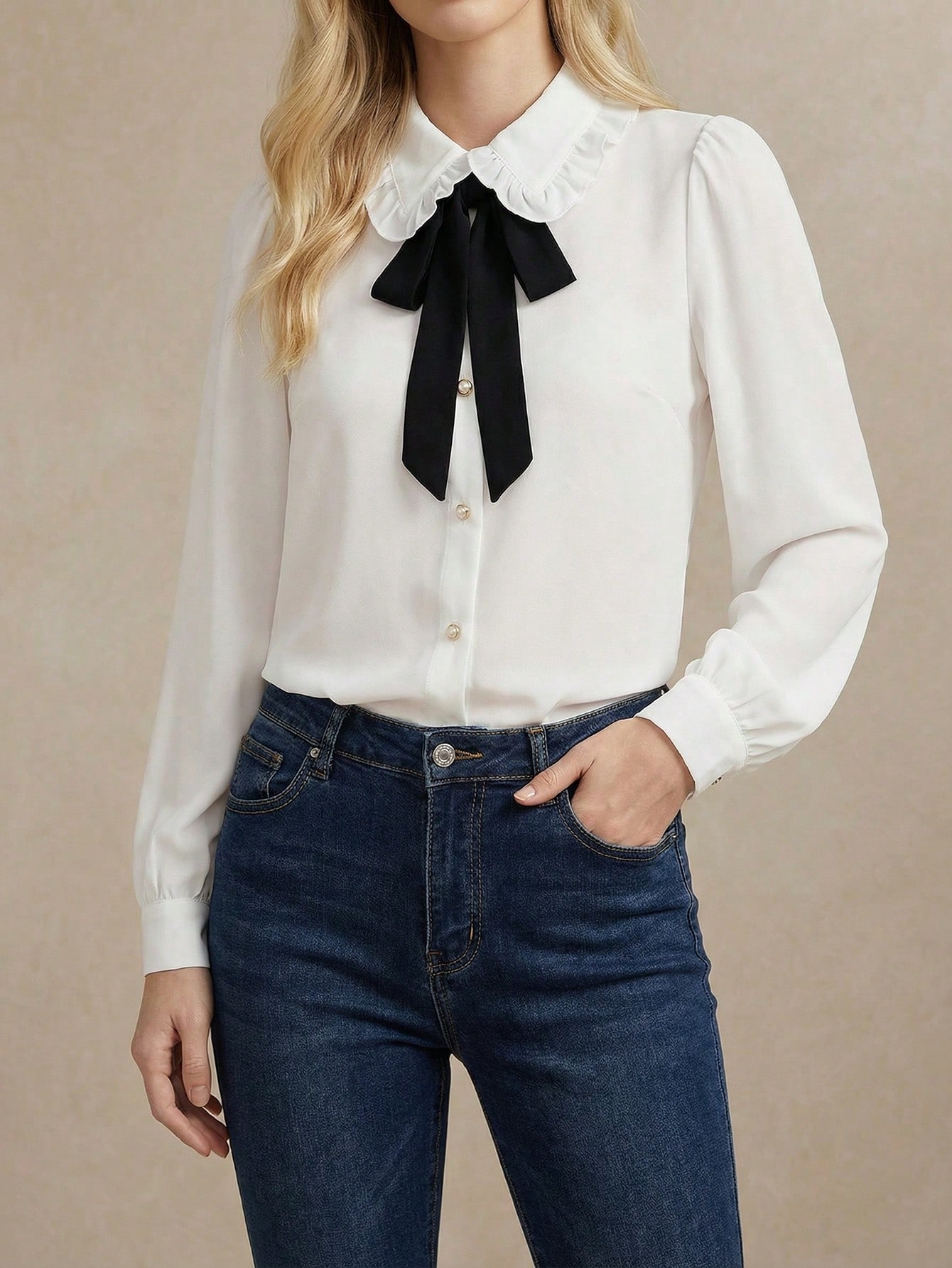 Blouse décontractée à manches longues, col claudine et manches à volants pour femmes. Élégante pour le travail et les déplacements, pour l'automne