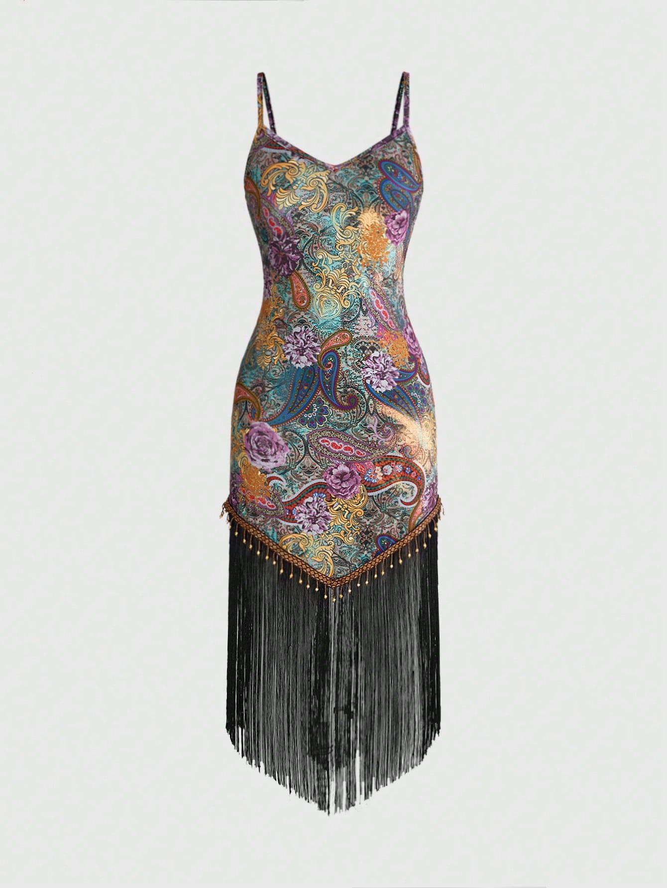 Robe midi femme à col V sexy, ourlet irrégulier à franges, dos nu, bretelles spaghetti. Imprimé rétro noix de cajou. Convient pour l'été, le style hippie western, boho, les concerts, les raves, les festivals de musique, le grunge et la campagne.