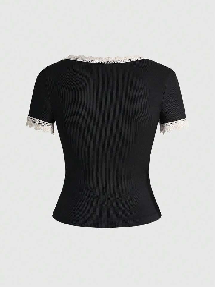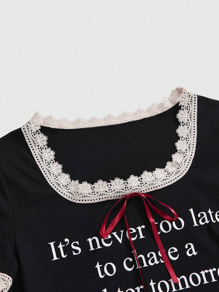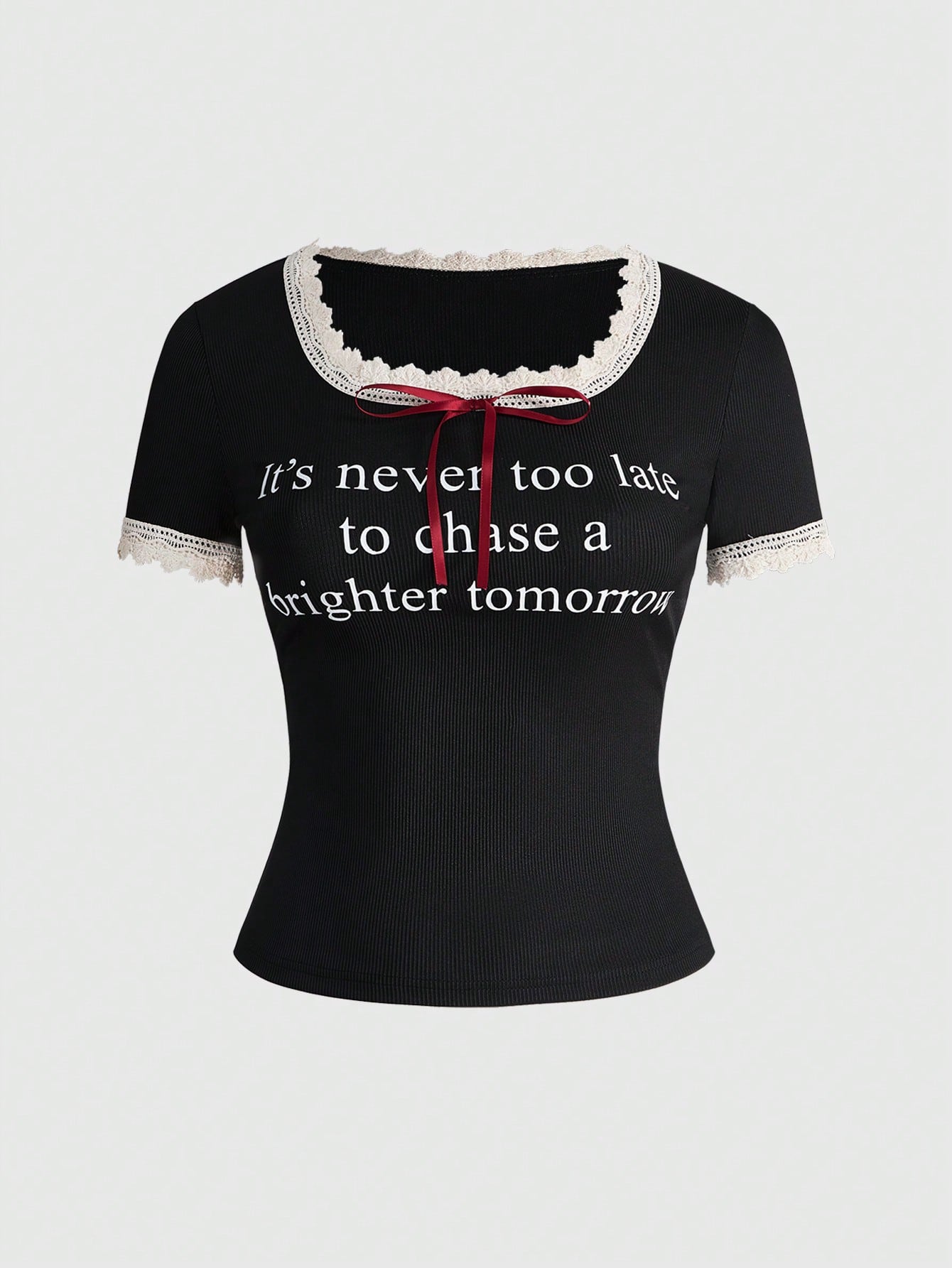 T-shirt ajusté d'été pour femmes avec slogan graphique, décoration en dentelle et nœud
