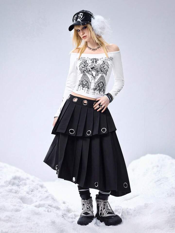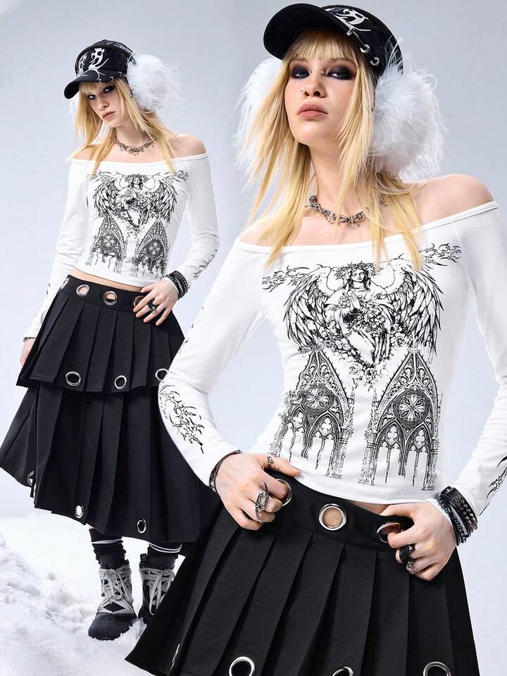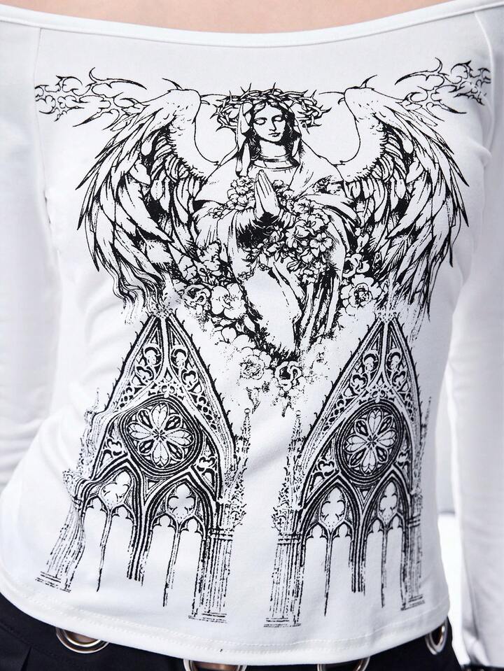 T-shirt moulant à manches longues avec imprimé de la Vierge Marie à l'épaule dégagée et col en V pour femmes, style gothique