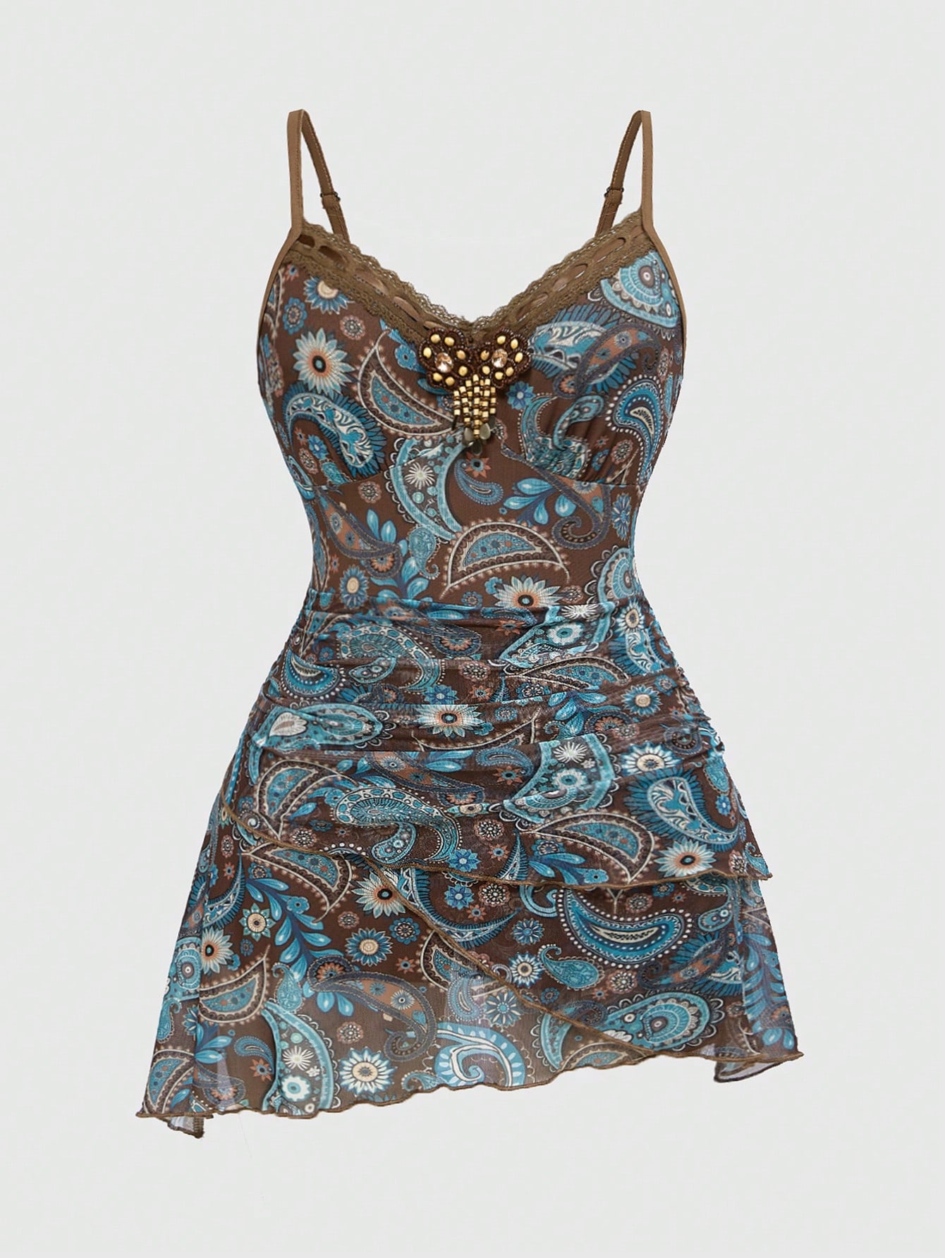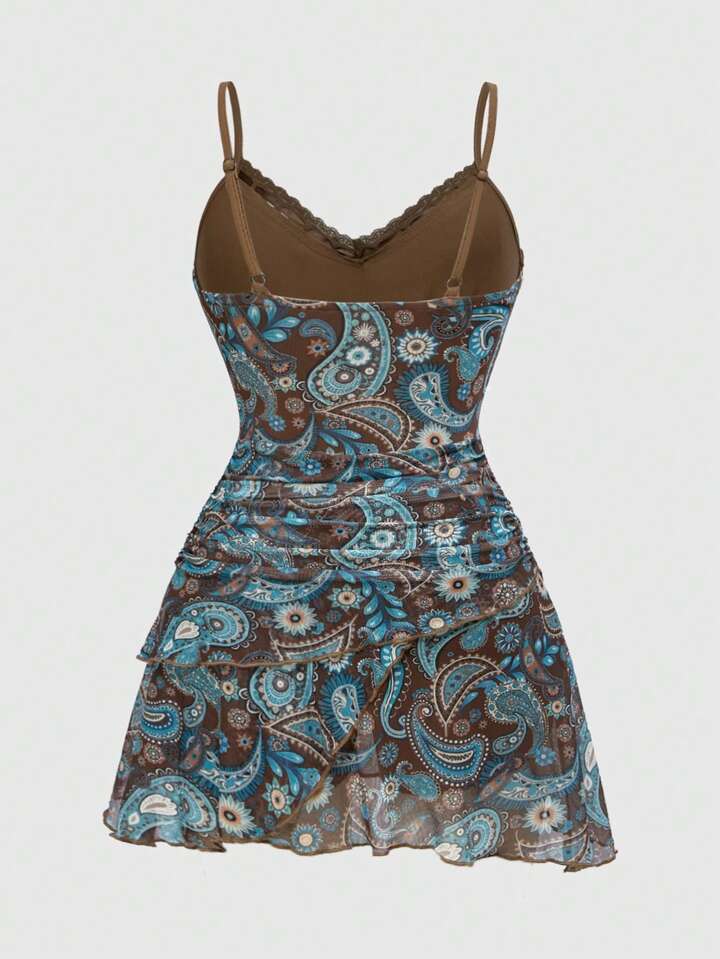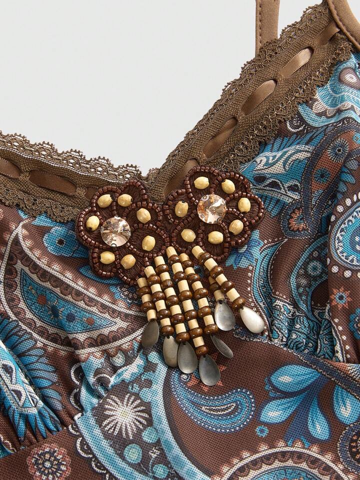 Robe mini femme vintage hippie à volants, ruban et dentelle avec imprimé cachemire