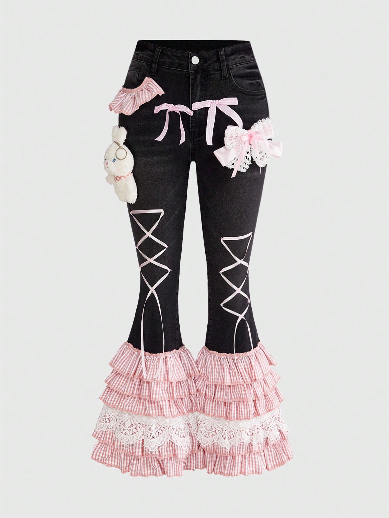Kawaii Pantalon évasé avec nœud, pendentif chat et dentelle, style Y2K esthétique pour femmes