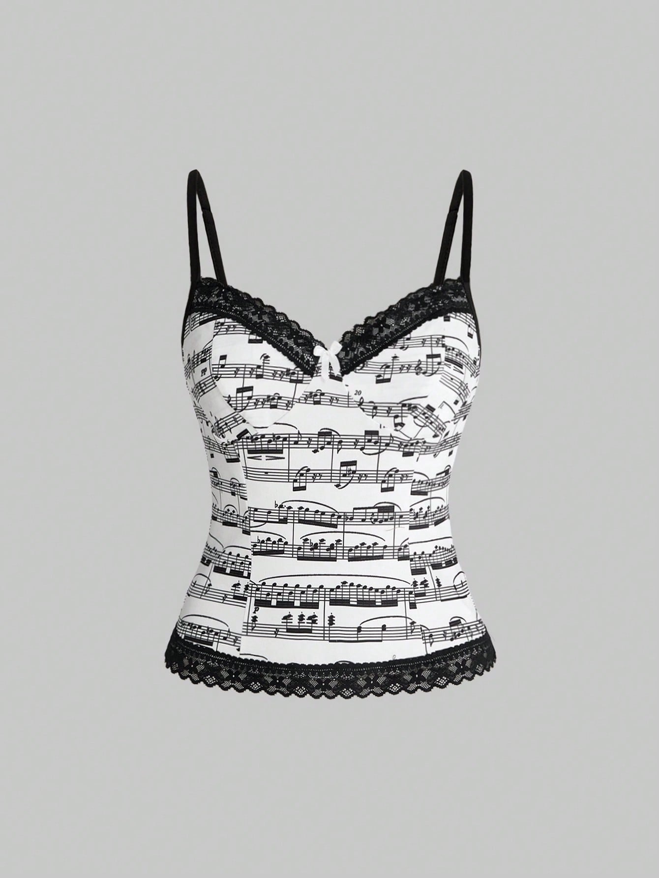 Femmes Y2K Débardeur matelassé à imprimé notes de musique avec garniture en dentelle contrastée