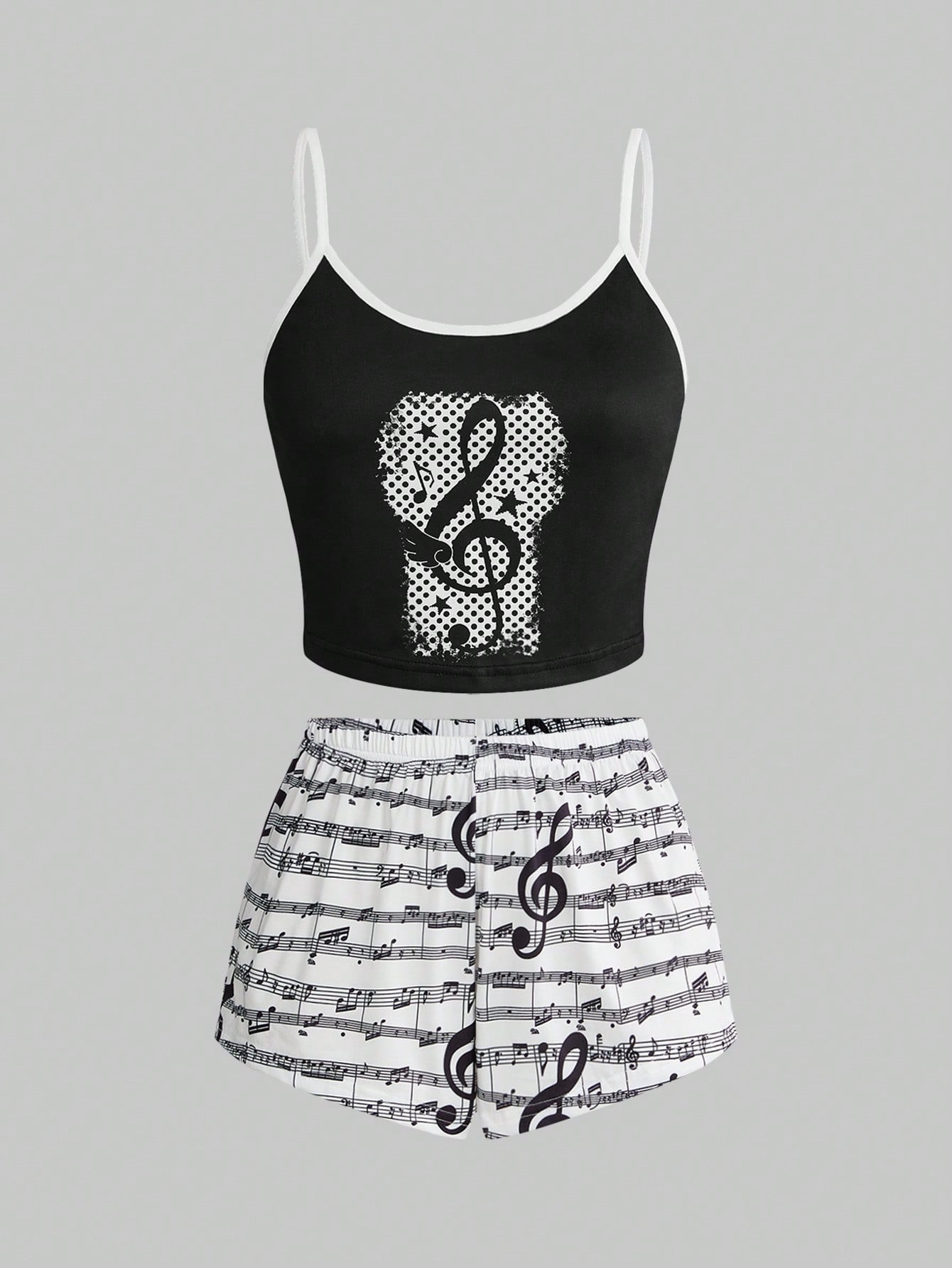 Ensemble pyjama camisole et short avec bordure contrastée de notes de musique gothique sombre de style Y2K