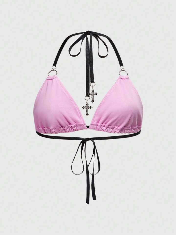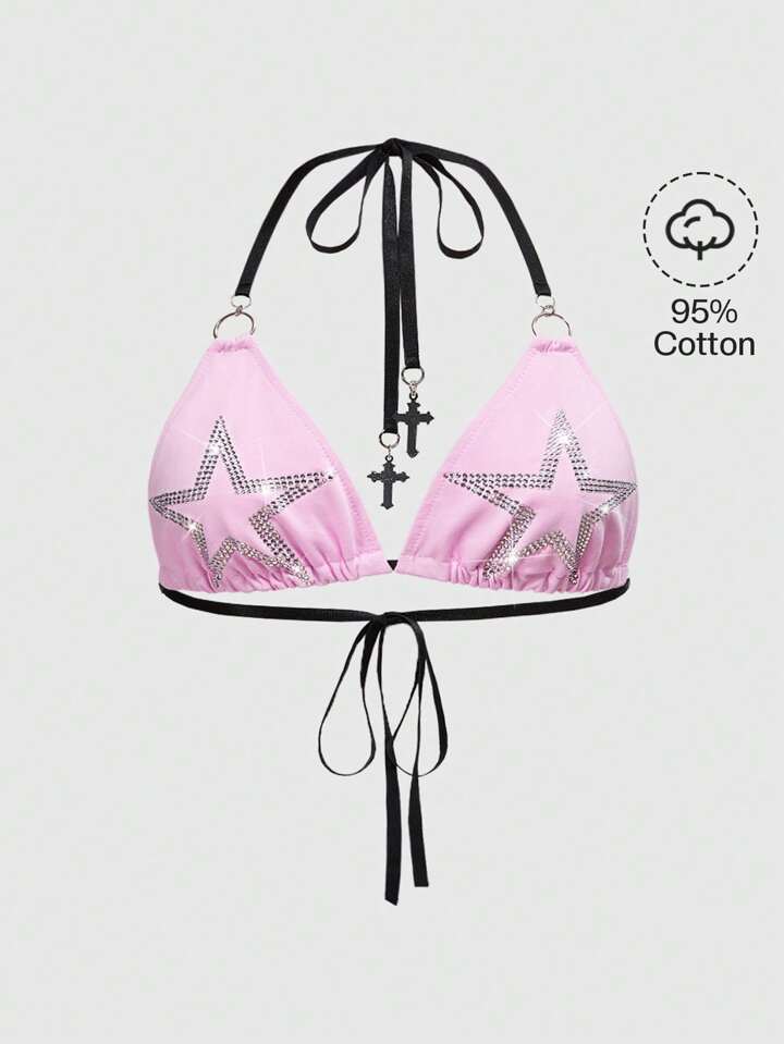 Top de bikini rose clair imprimé d'étoiles strass, style grunge rock des années 2000, festival de musique Y2K