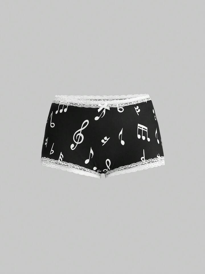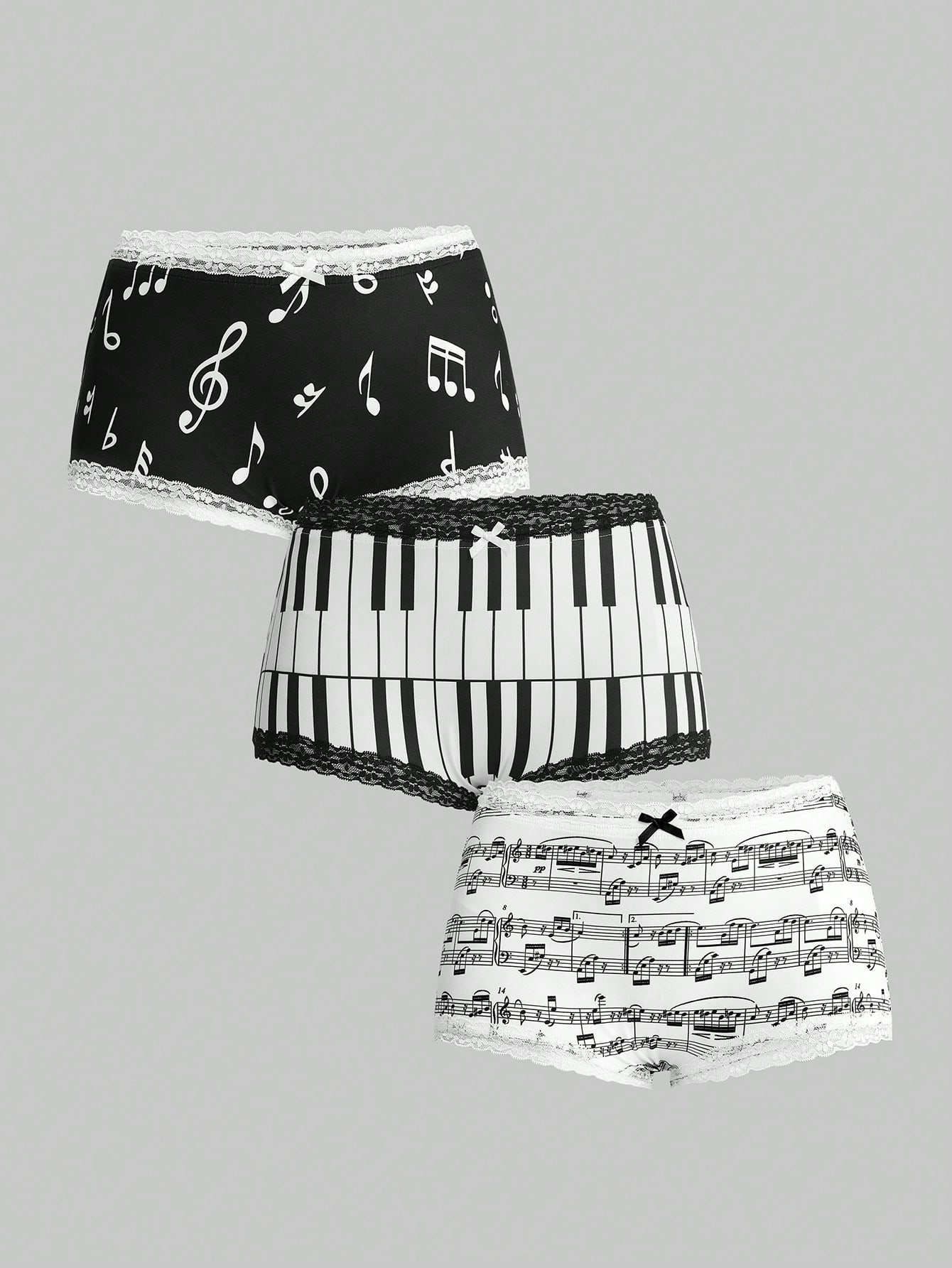 Ensemble de 3 pièces de shorts taille basse avec bordure en dentelle imprimée de notes de musique et de clavier de piano dans un style rétro Y2K