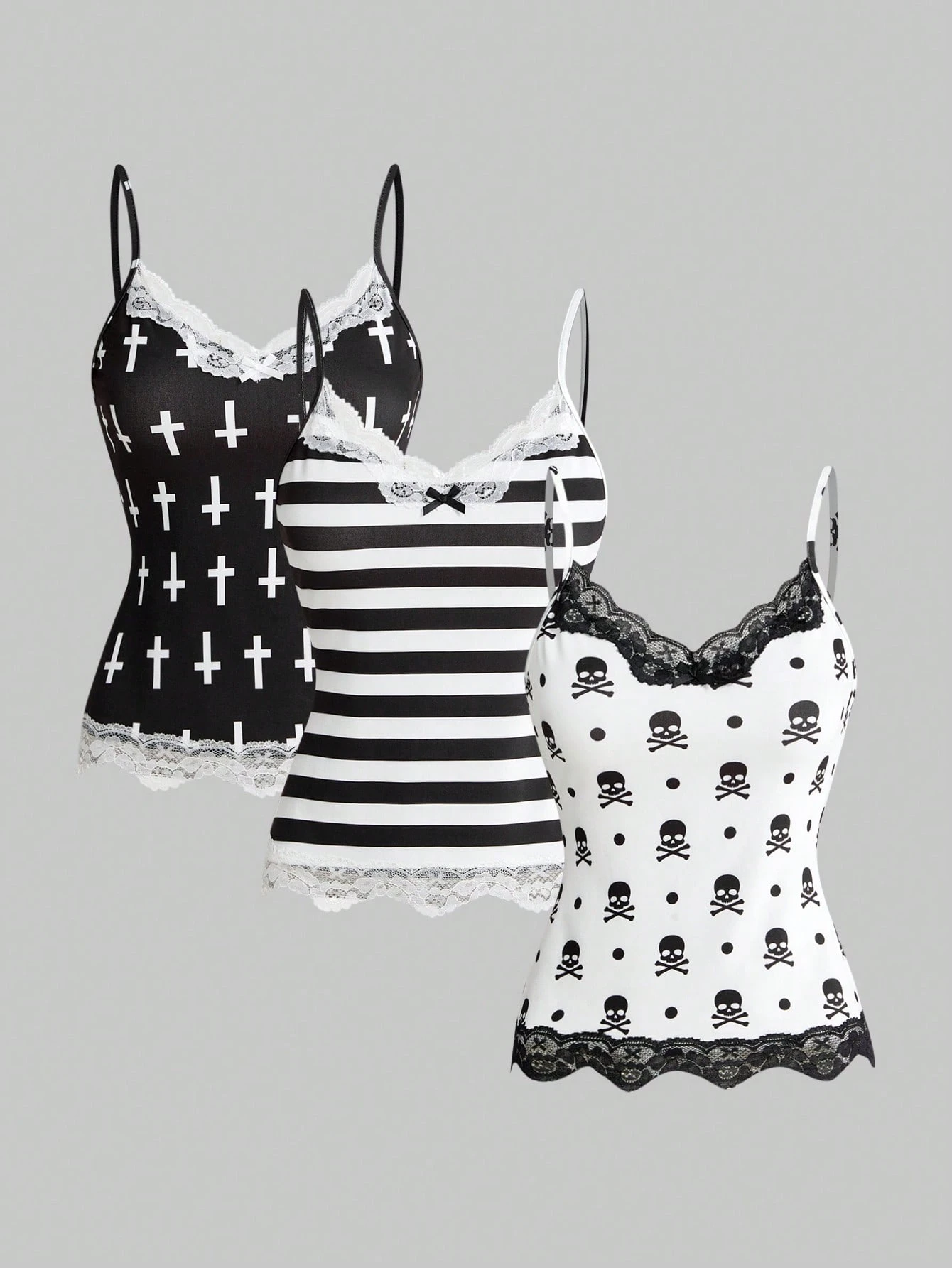 Ensemble de 3 pièces comprenant un débardeur avec dentelle et imprimé de notes de musique et de clavier de piano, dans un style rétro Y2K