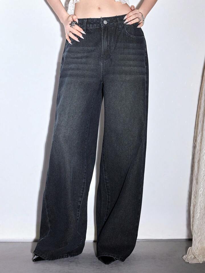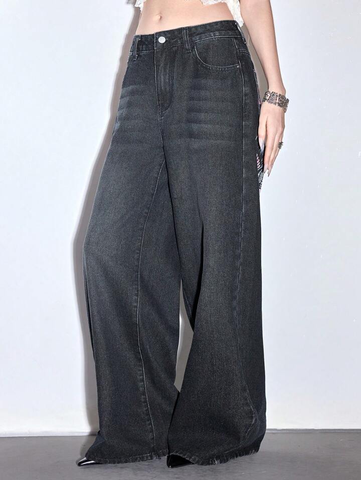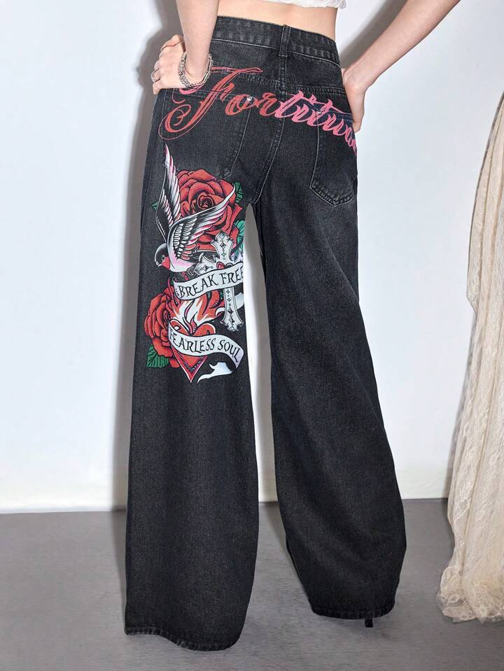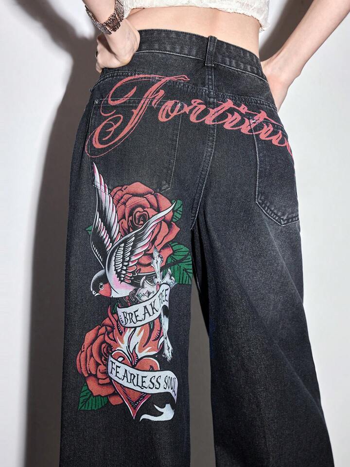 Jeans femme taille basse, coupe ample et jambes larges, avec imprimé ailes croisées, style streetwear hip-hop chic Y2K