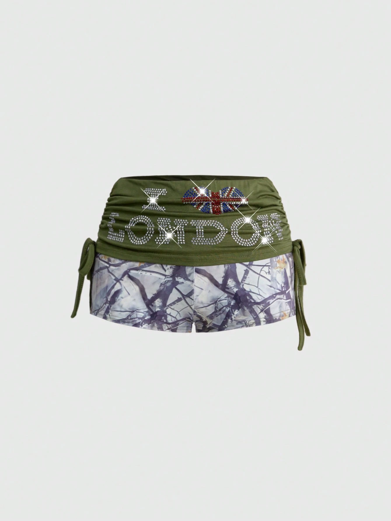 Y2K Jupe mini ornée de strass, style de rue pour femmes. Short à imprimé branche d'arbre et motif végétal