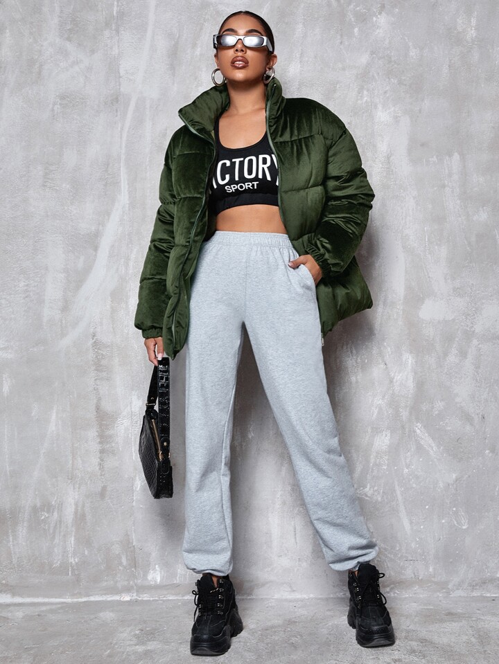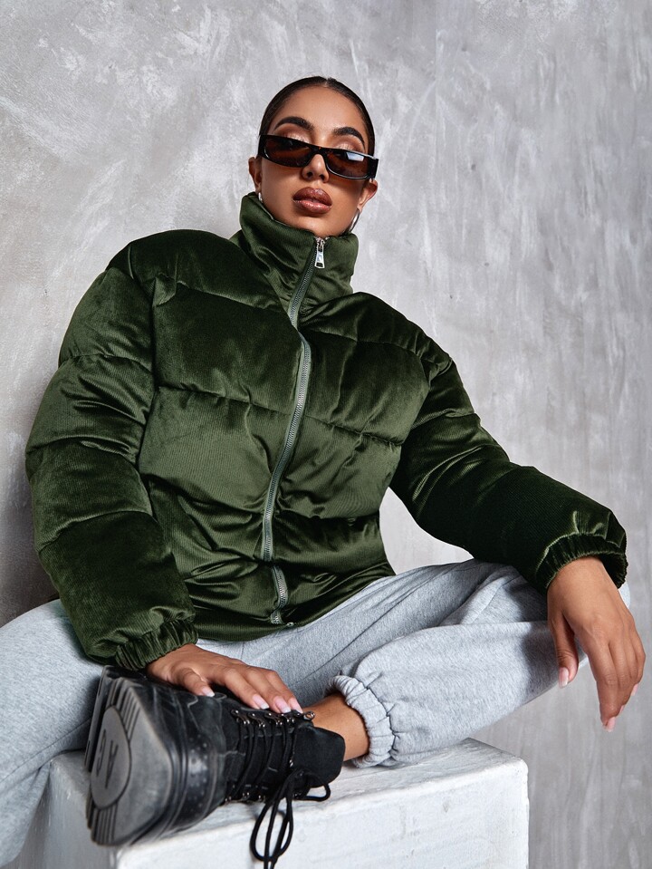 Manteau matelassé à col en entonnoir en velours côtelé avec fermeture éclair