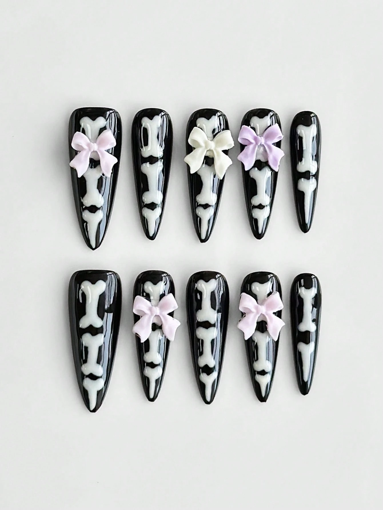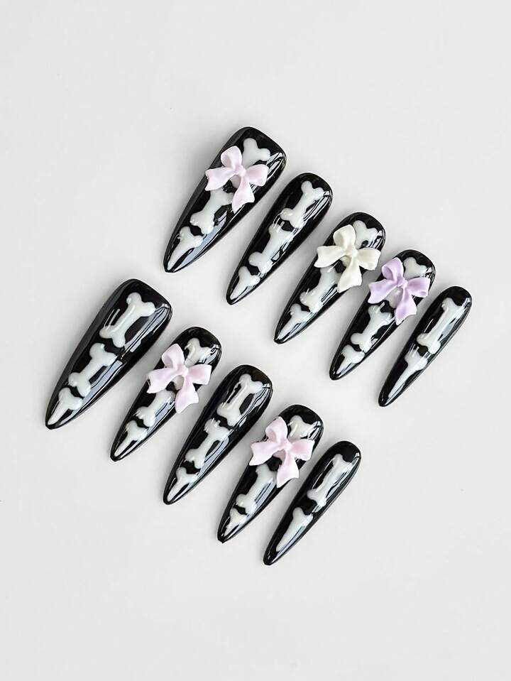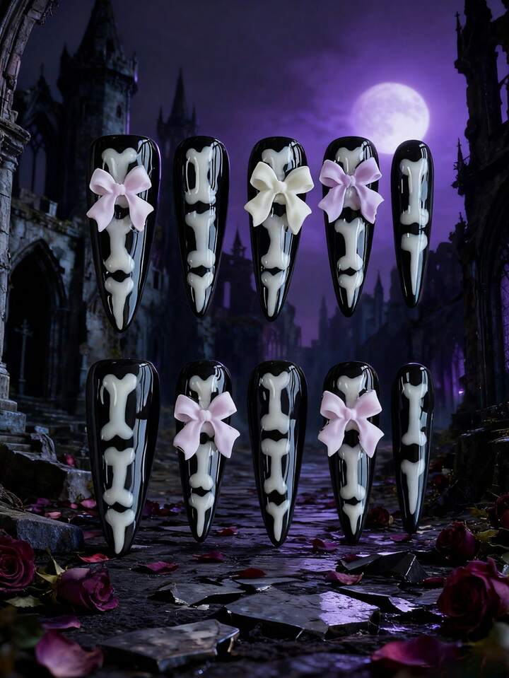 Goth 10 pezzi di unghie finte stile punk scuro realizzate a mano per Ognissanti + 3 fogli di adesivo biadesivo, set di manicure gotico Y2K, rimovibile, decorato con strass e catena di perle finte, adatto per festival, feste, balli e uso quotidiano