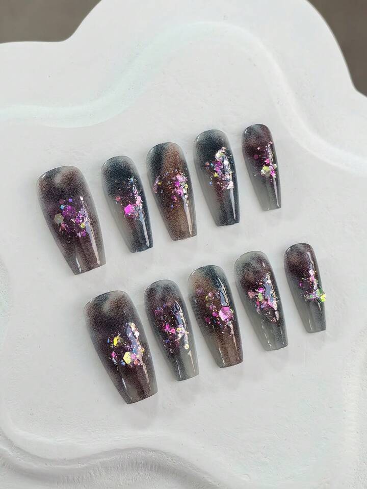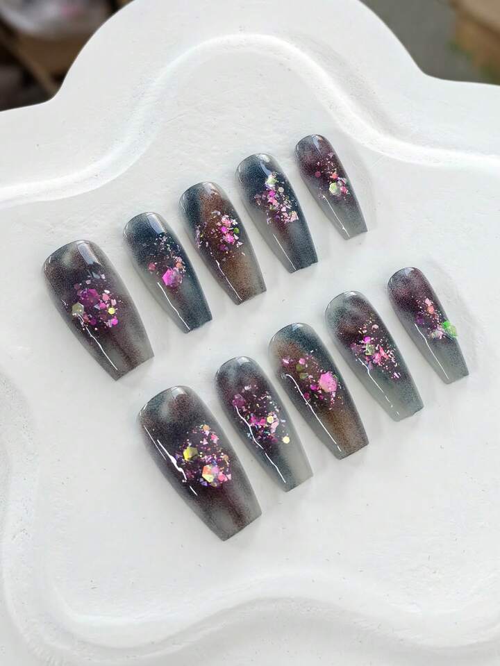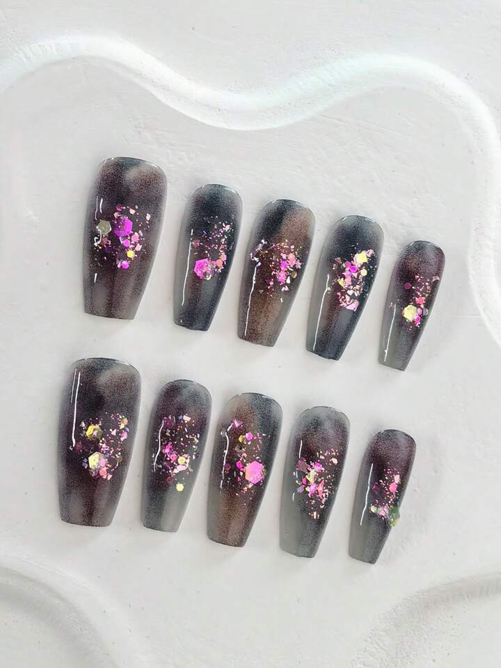 Goth 10 pezzi di unghie finte riutilizzabili in stile gotico scuro con sfumatura viola-rossa in autunno, con glitter e gel trasparente