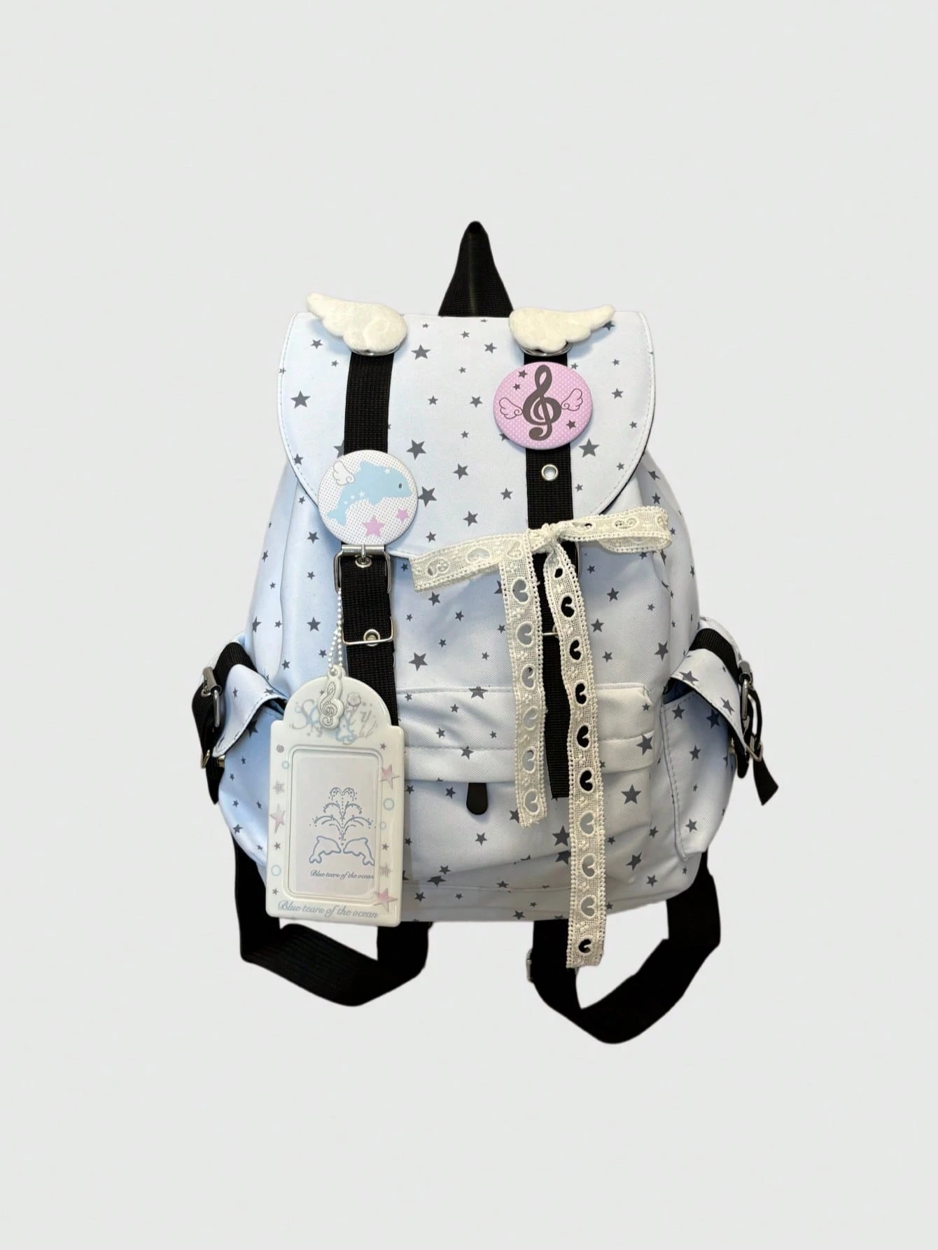 1 pezzo Zaino da donna alla moda e casual con grande capacità, stile versatile semplice e carino, con motivo a stelle e ali, tasche multiple, adatto per scuola, pendolarismo, uso quotidiano e tempo libero, in stile college blu kawaii