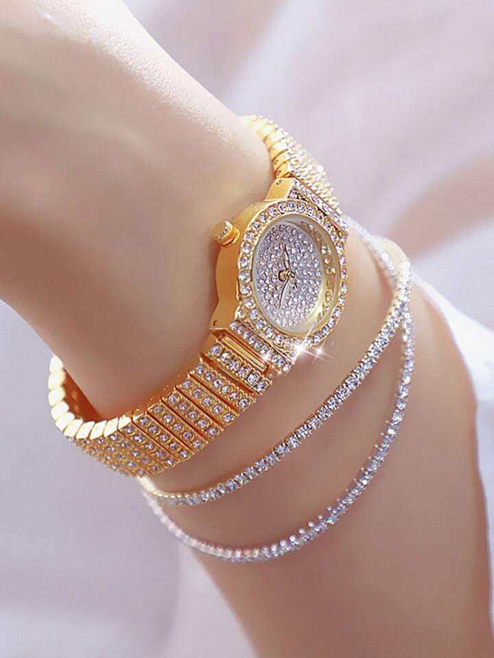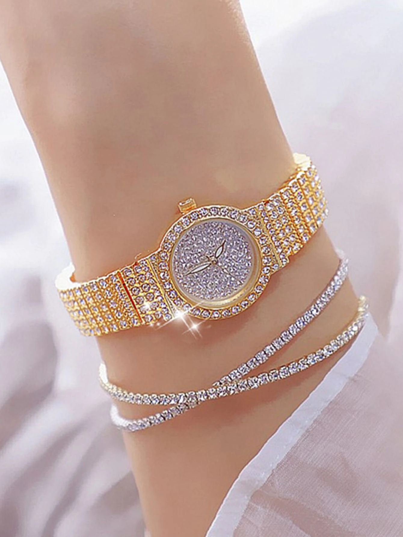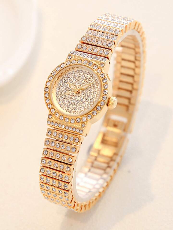 1 pezzo orologio al quarzo con decorazioni in strass e 2 pezzi braccialetti