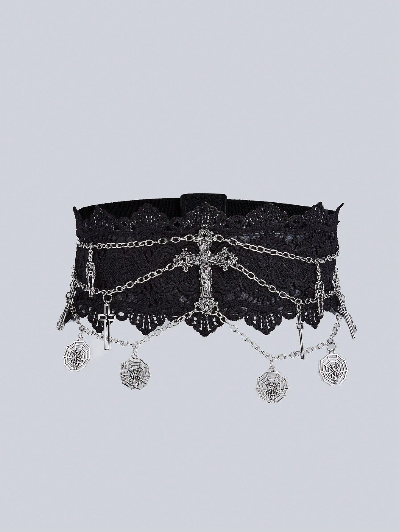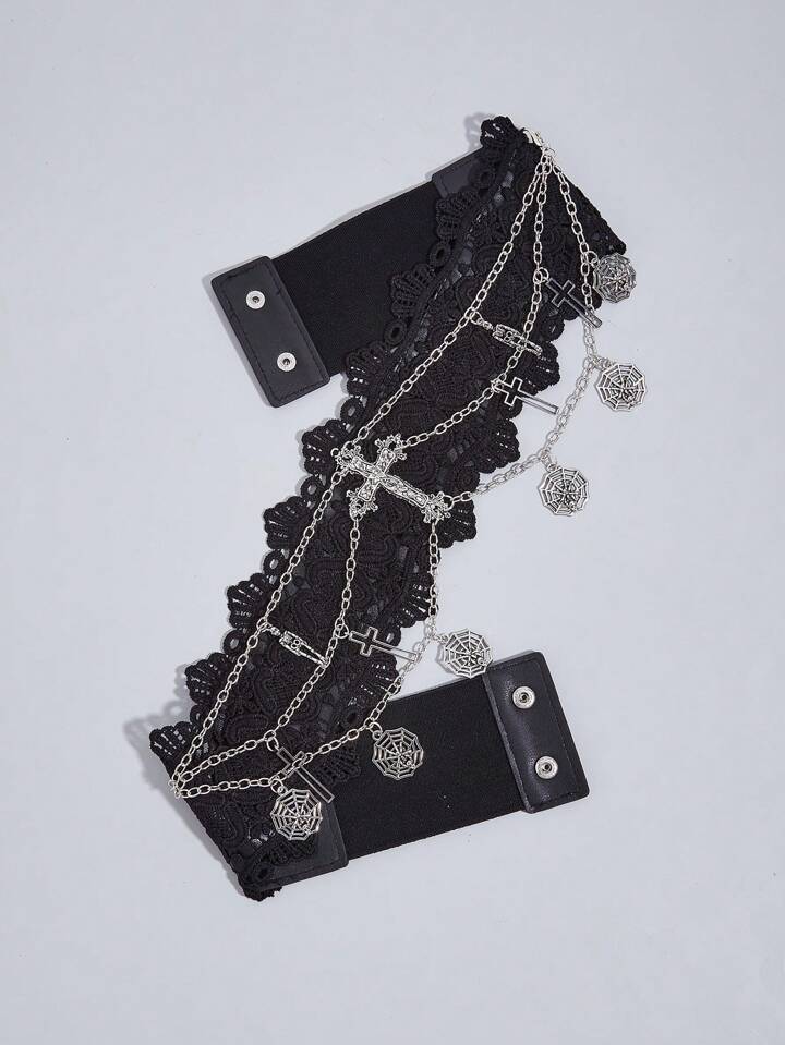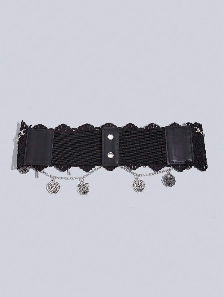 Goth 1 pezzo Cintura gotica per vestiti da donna in stile gotico, in tessuto elastico nero con pizzo a 3 strati, decorazione a catena, teschio e ragnatela, versatile per uso quotidiano