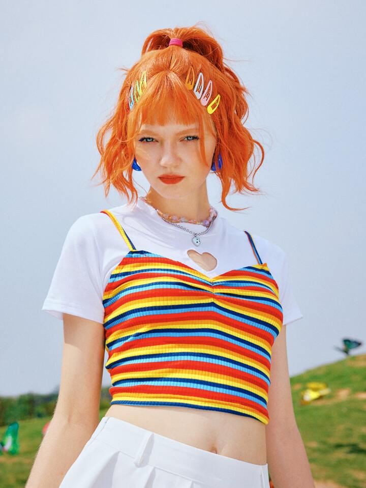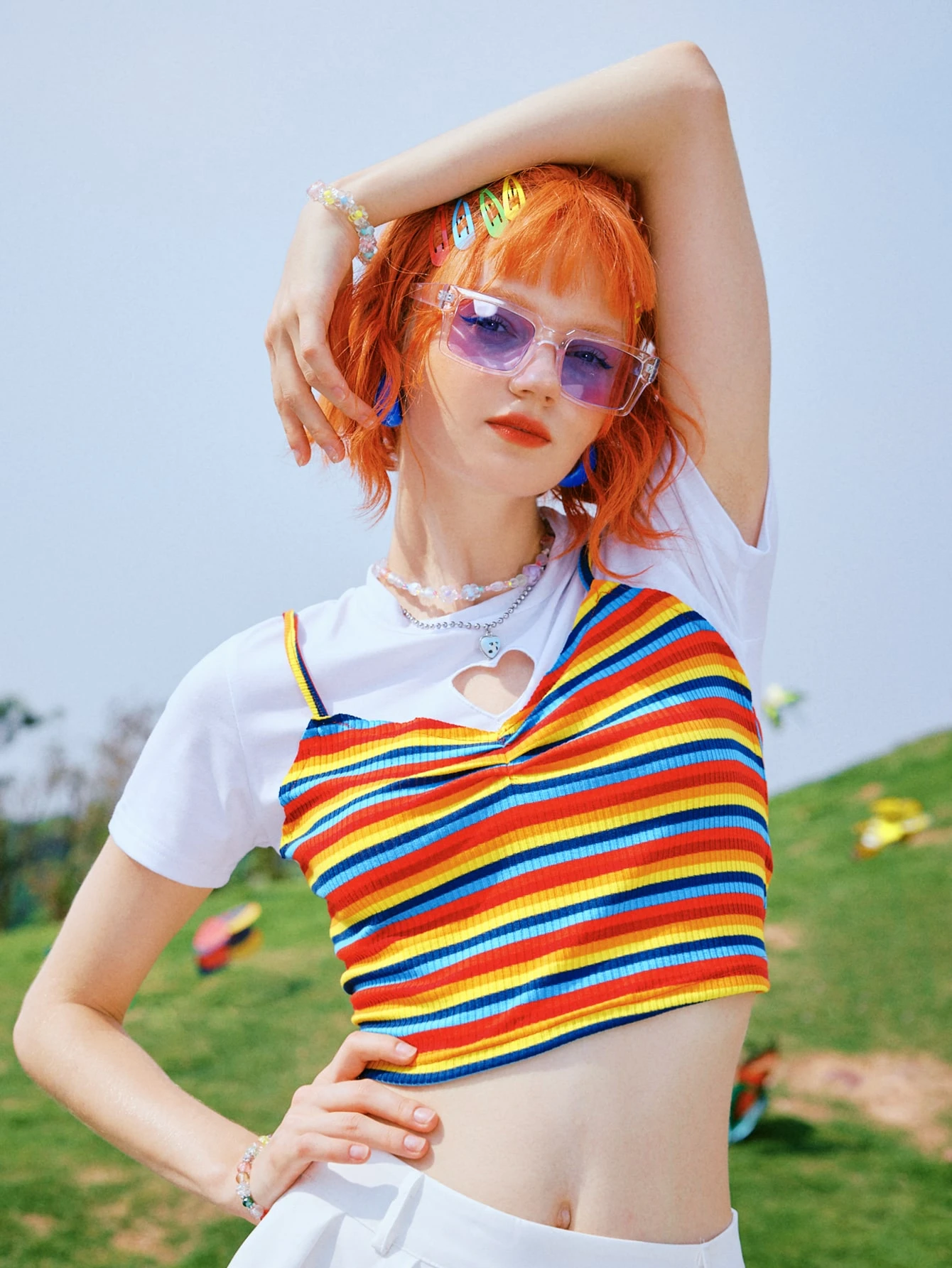 Maglietta 2 in 1 a righe arcobaleno cuore scavato