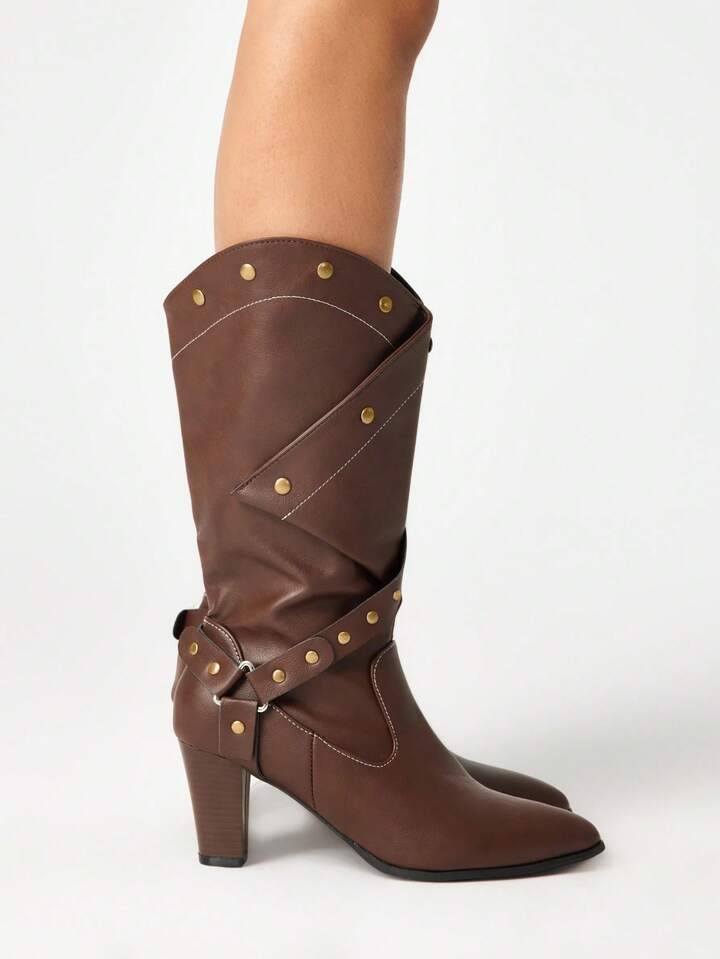 2025 Nuovi stivali da cowboy western con tacco sottile alto in PU con borchie, stivali da donna, stivali da equitazione con tacco impilato