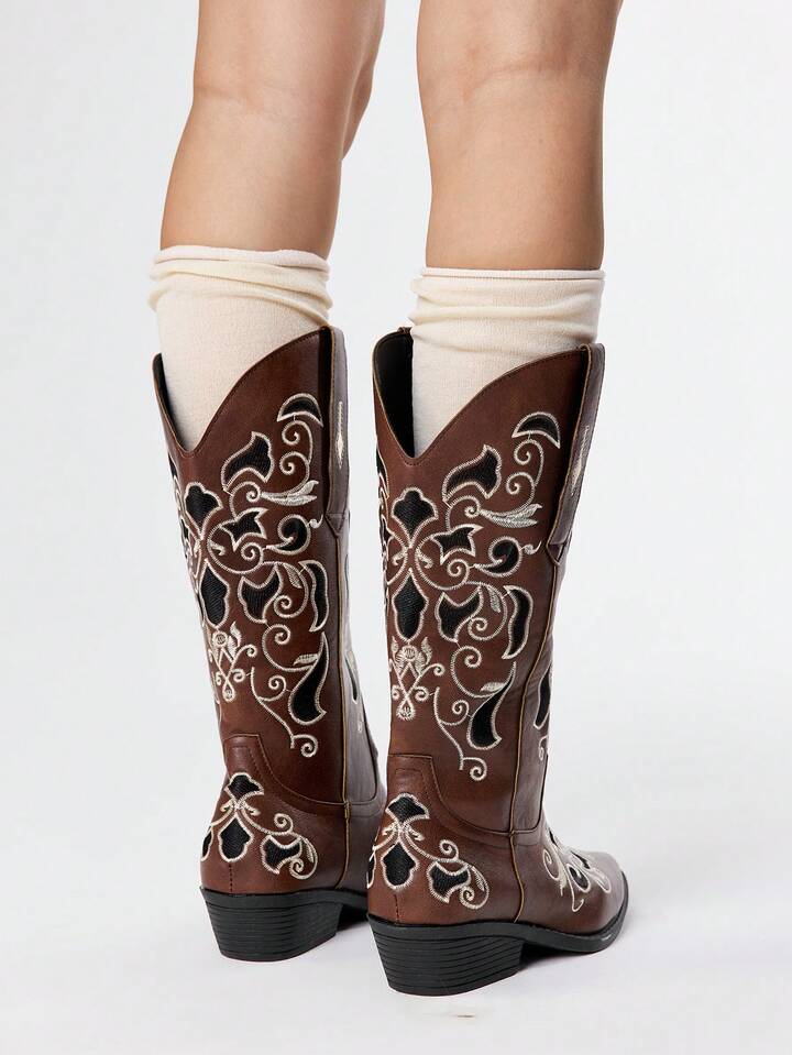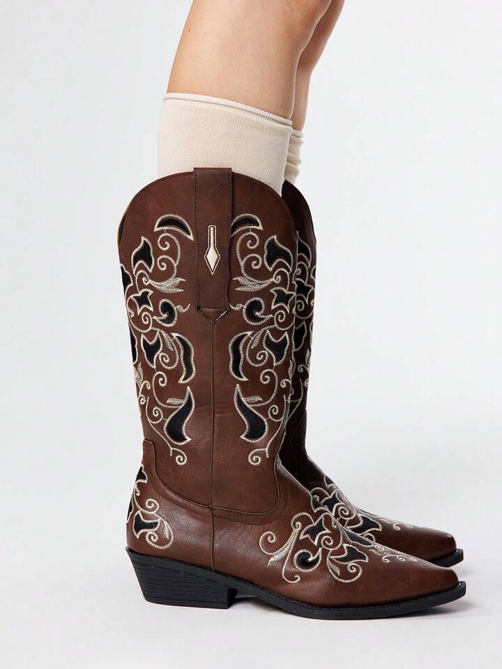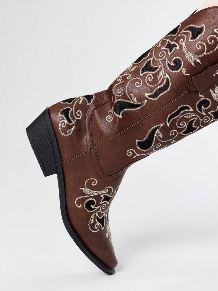 2025 Stivali western in PU marrone con punta affusolata e ricamo, stivali alti aderenti, stivali da equitazione con tacco largo per donne, moda primavera/autunno